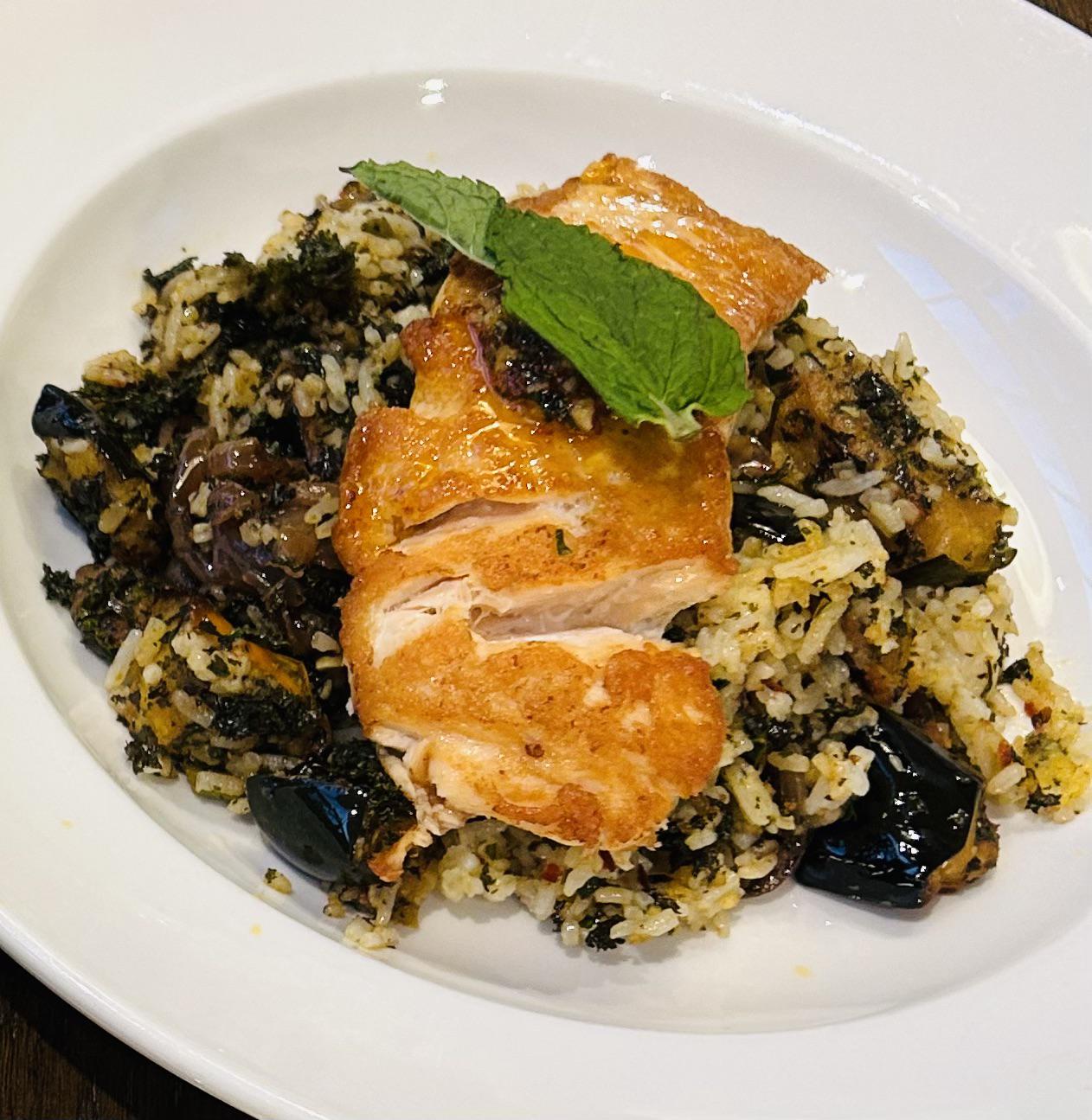 Pan Seared Pork Steak with Apple Cider Sauce and Caramelised Apples. Served with Gratin and Sautéed Brocolli. Finished with Crispy Sage Leaves.