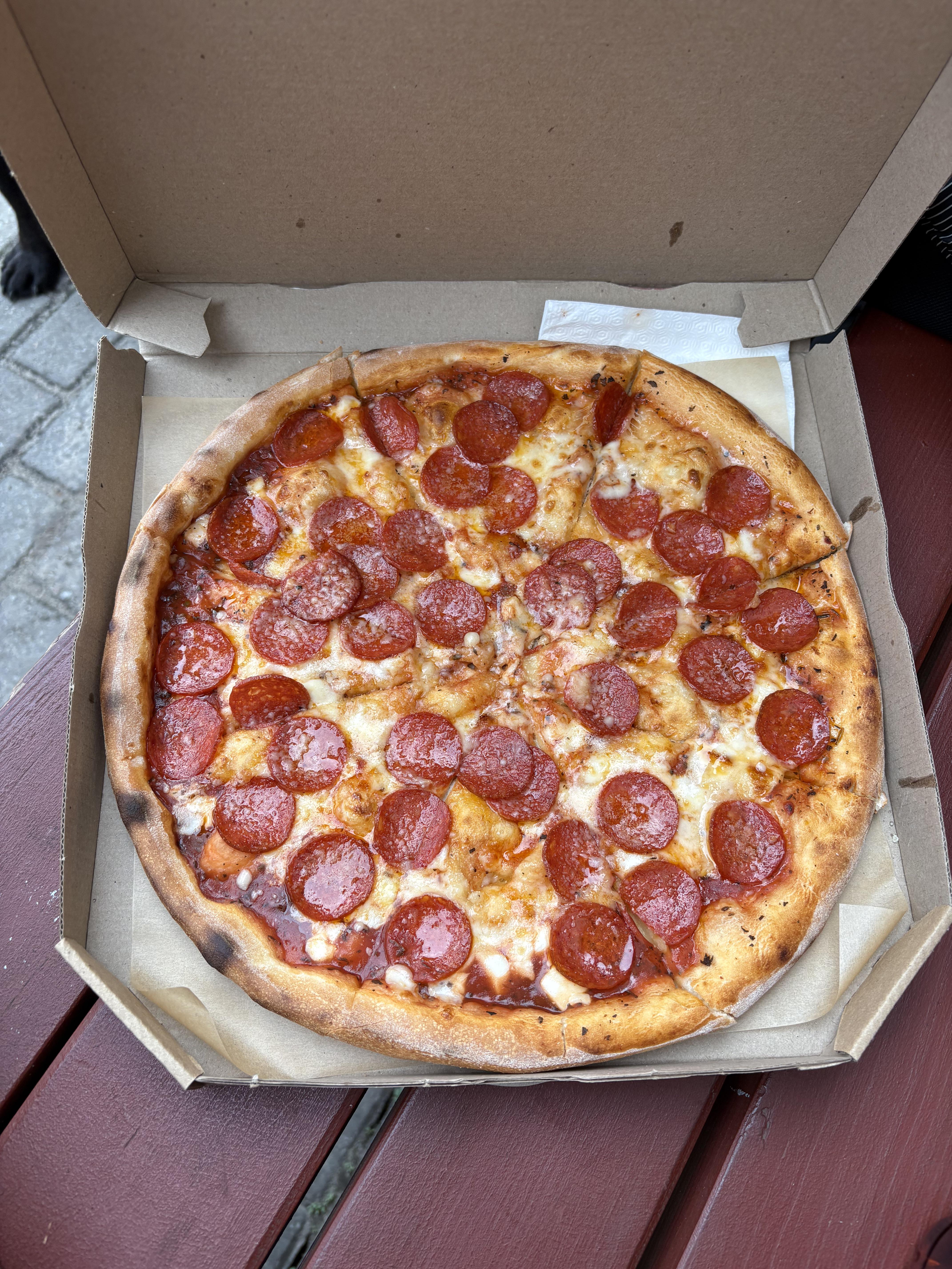 [I ate] Pepperoni pizza with extra cheese and crispy crust from a local pizzeria.