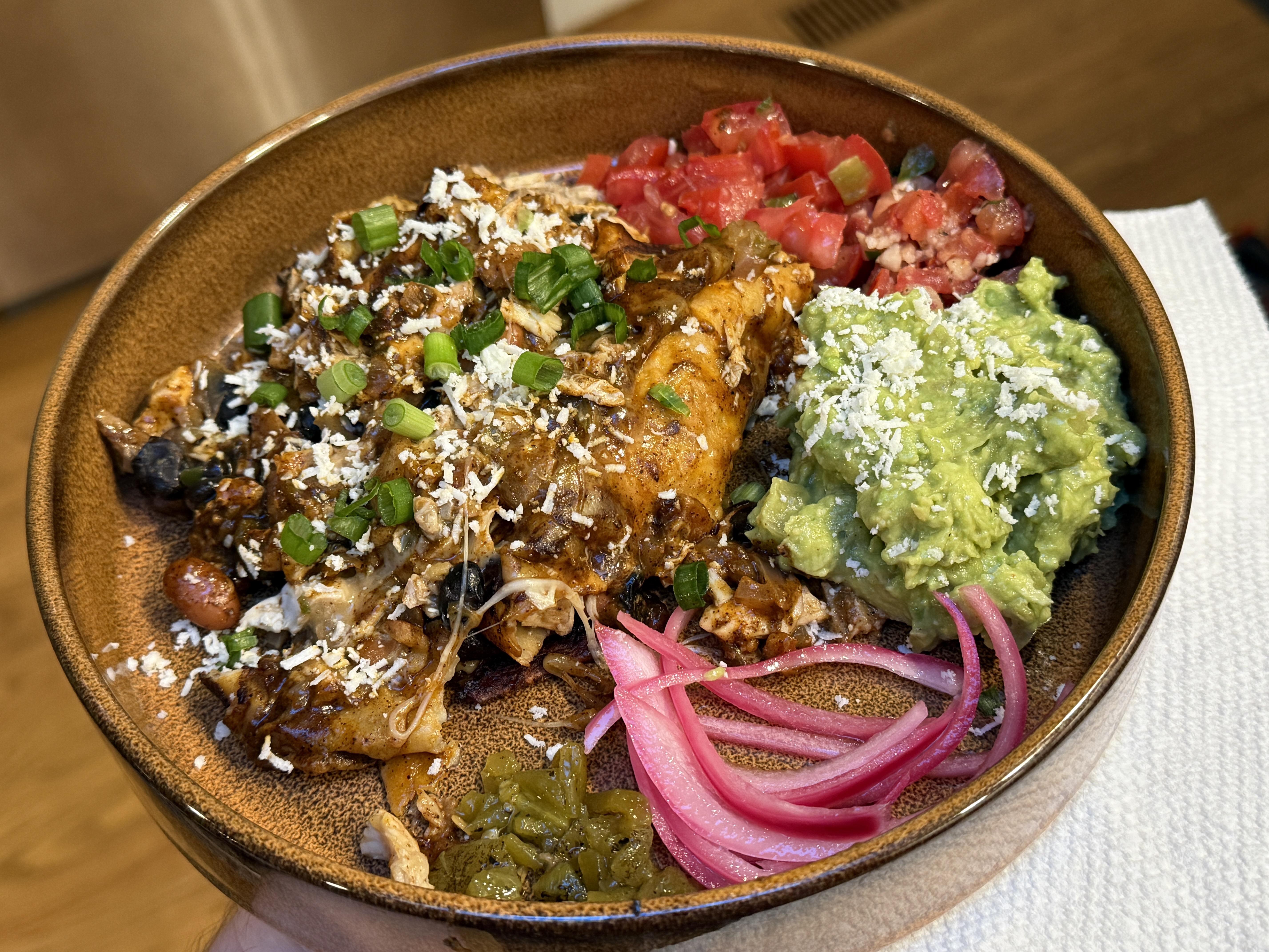 Homemade enchilada with all the fixings. Pico, salsa, guacamole, fire roasted chilies and pickled onions by kinkadec Food Porn