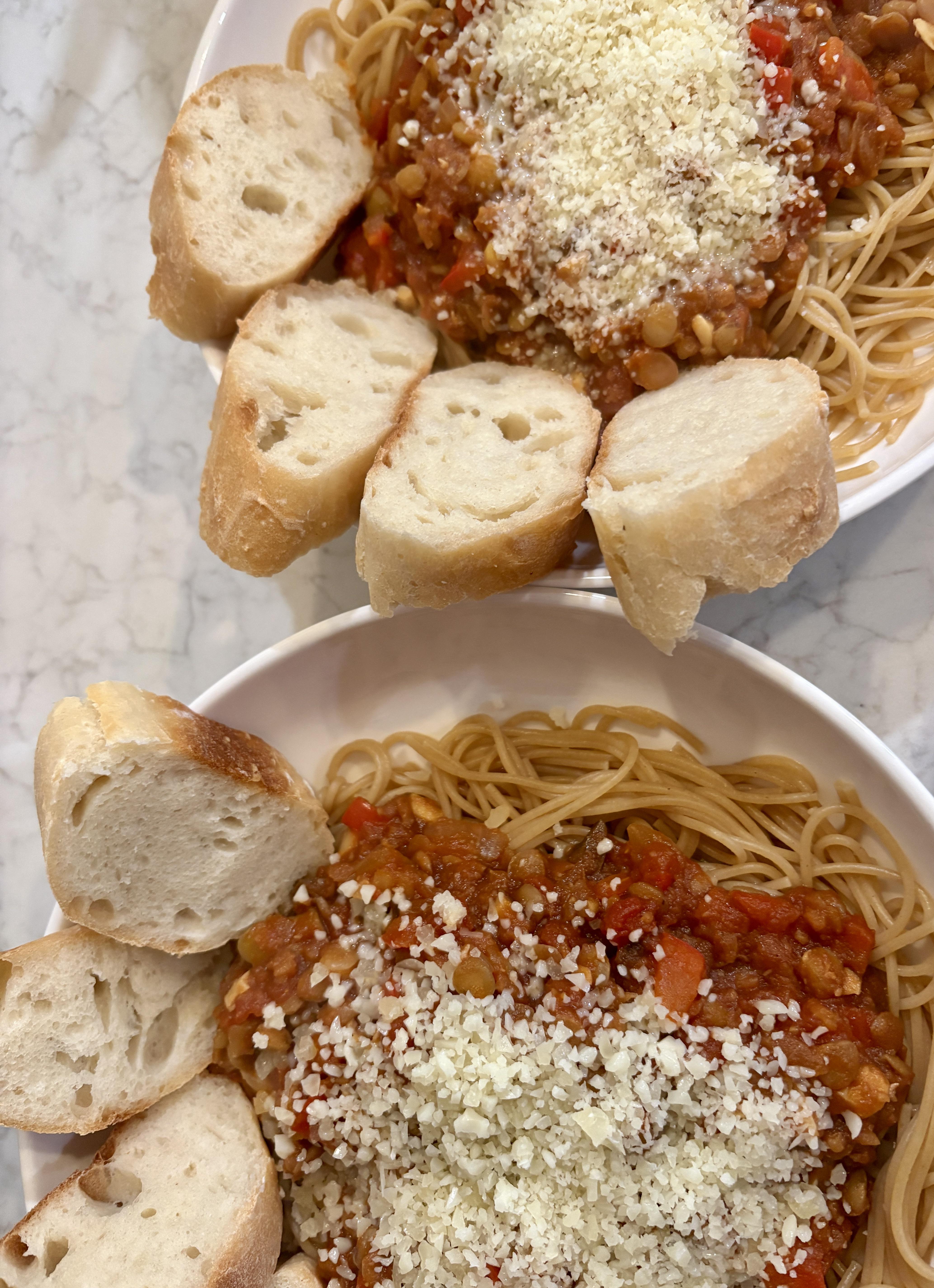Leftover-Cheese on April 3, 2026 12:23 am I used green lentils, mushrooms, red bell pepper, diced tomato & paste and of course onion, garlic and spices for the bolognese. I guess technically more of a ragu, but I can’t change the title! Baguette recipe: https://lechefswife.com/baking-baguettes-for-beginners/#tasty-recipes-1526-jump-target