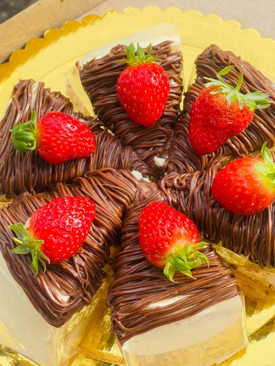 Perfectly sliced layered cake topped with chocolate drizzle and fresh strawberries. by Shoddy_hero Food Porn