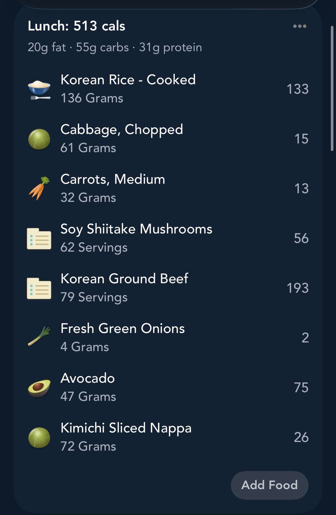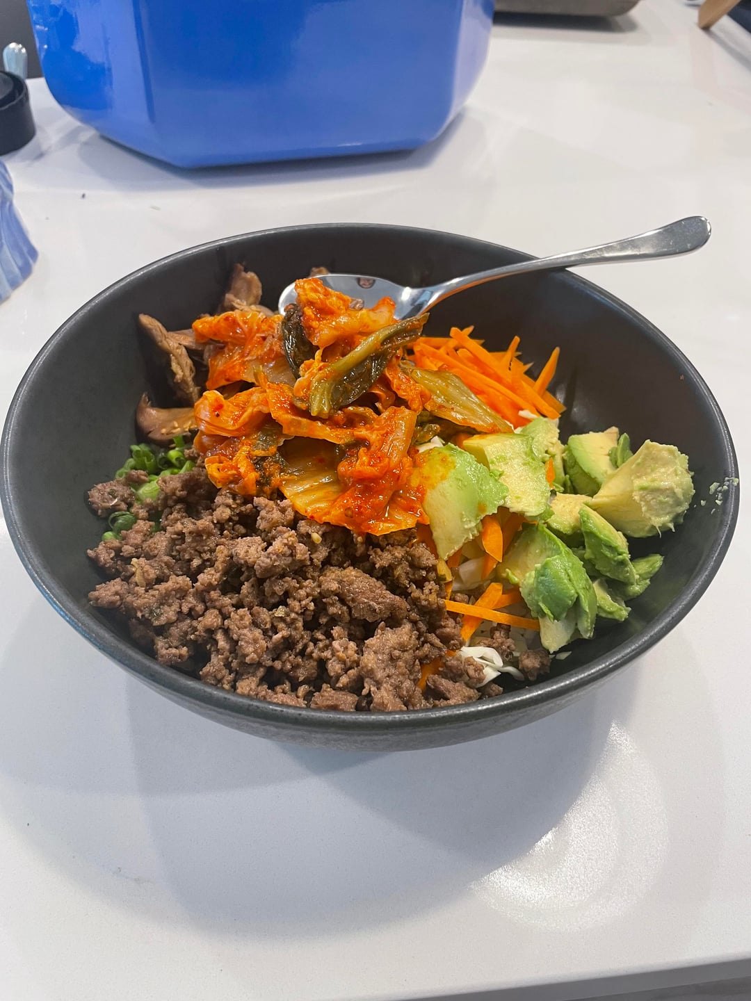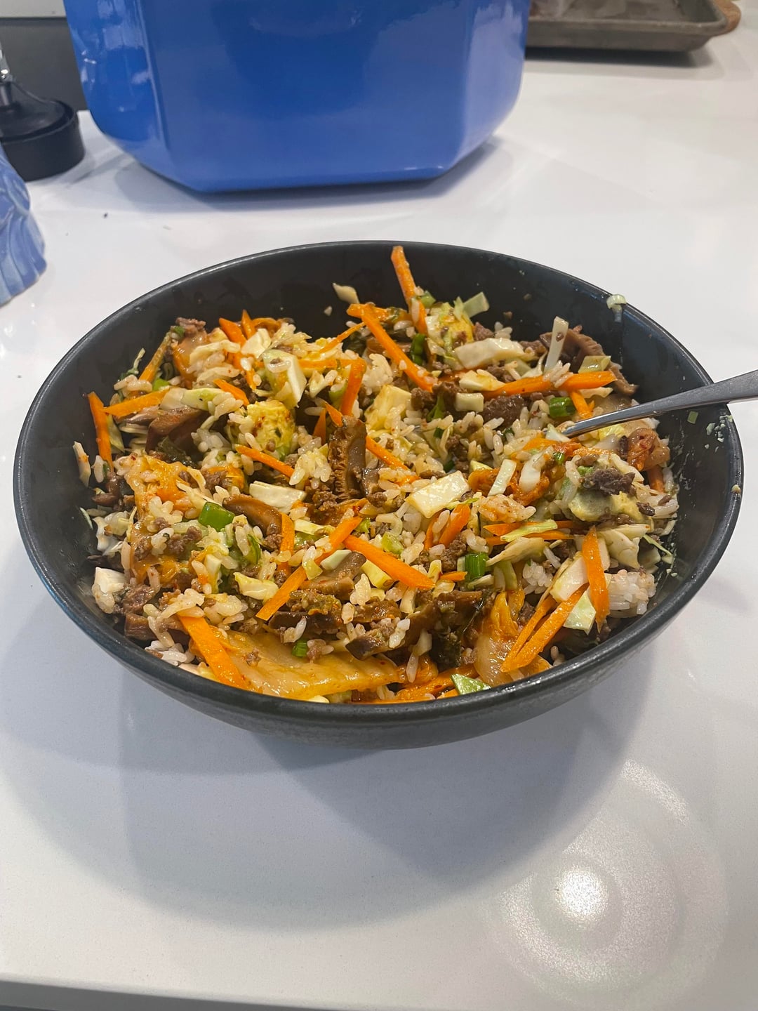 Add a small scoop of rice. Add a ton of raw cabbage and carrots. Some sort of protein. Here, I did a bulgogi flavored ground beef, but last week was soy sauce marinated baked salmon. And then I do accompanying veggies to bulk it up. The key is that you need one of the veggies to be sautéed in soy sauce for a really strong punchy flavor when you mix it all up. No need for sauces this way. I did shiitake mushrooms sauteed in soy sauce, avocado, and kimchi this week. Last week was avocado, edamame, and bok choy sautéed in soy sauce.