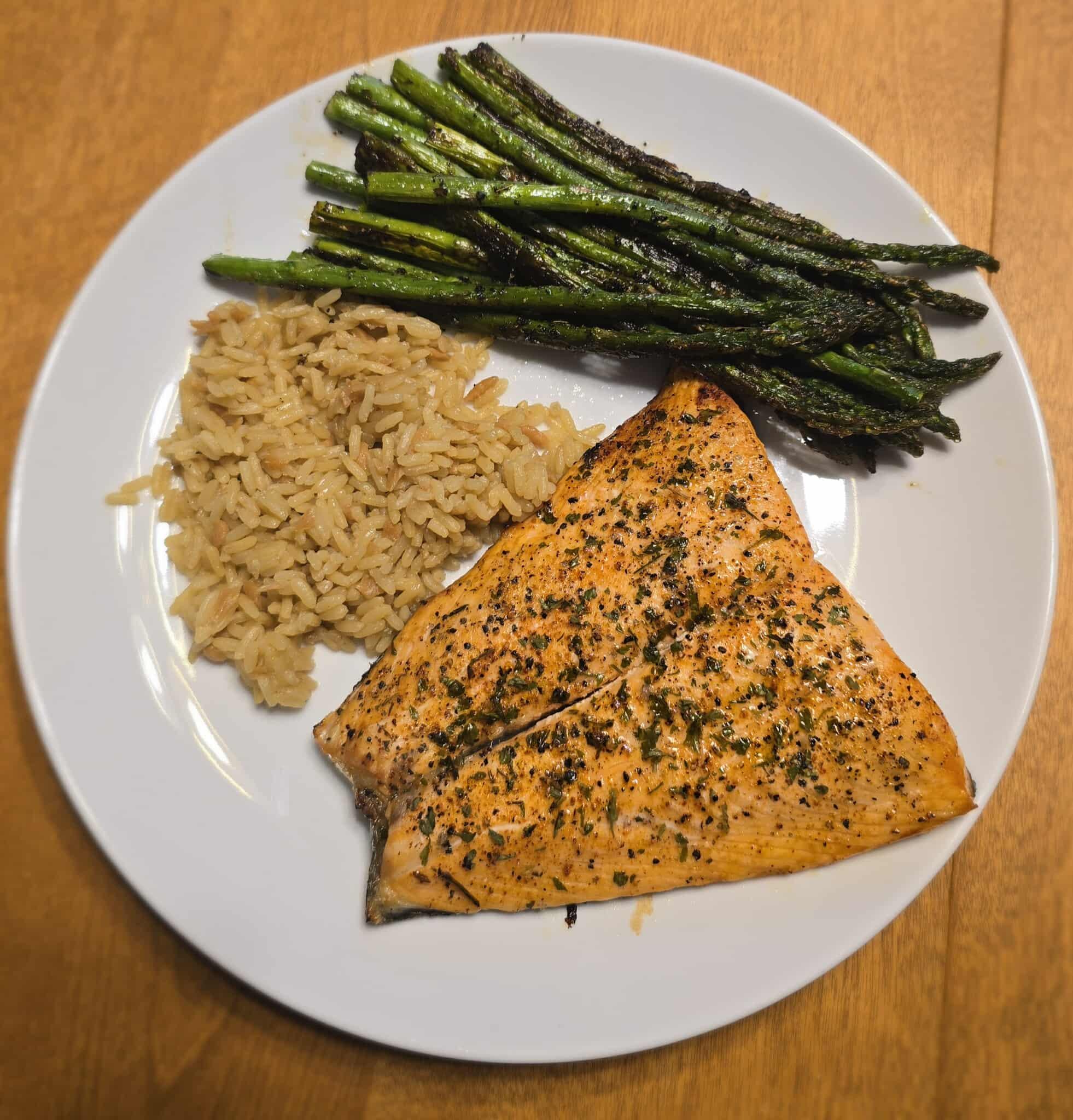 Oven-baked salmon w/ pan-fried asparagus and rice pilaf