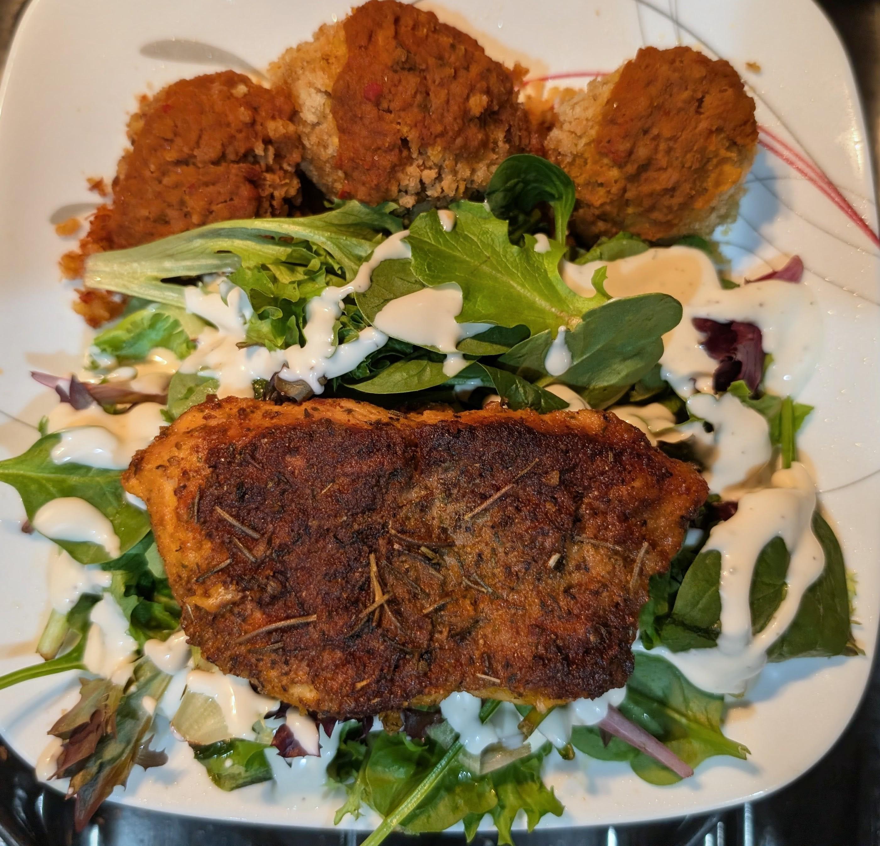 Pan-Fried Suya-Spiced Salmon on a Bed of Mixed Salad Greens, with Ranch Dressing, and Yam Balls, Filled with Sardines, Vegetables, and Hot Peppers. by stroke_survivor Dinner Tonight Tonight's Dinner