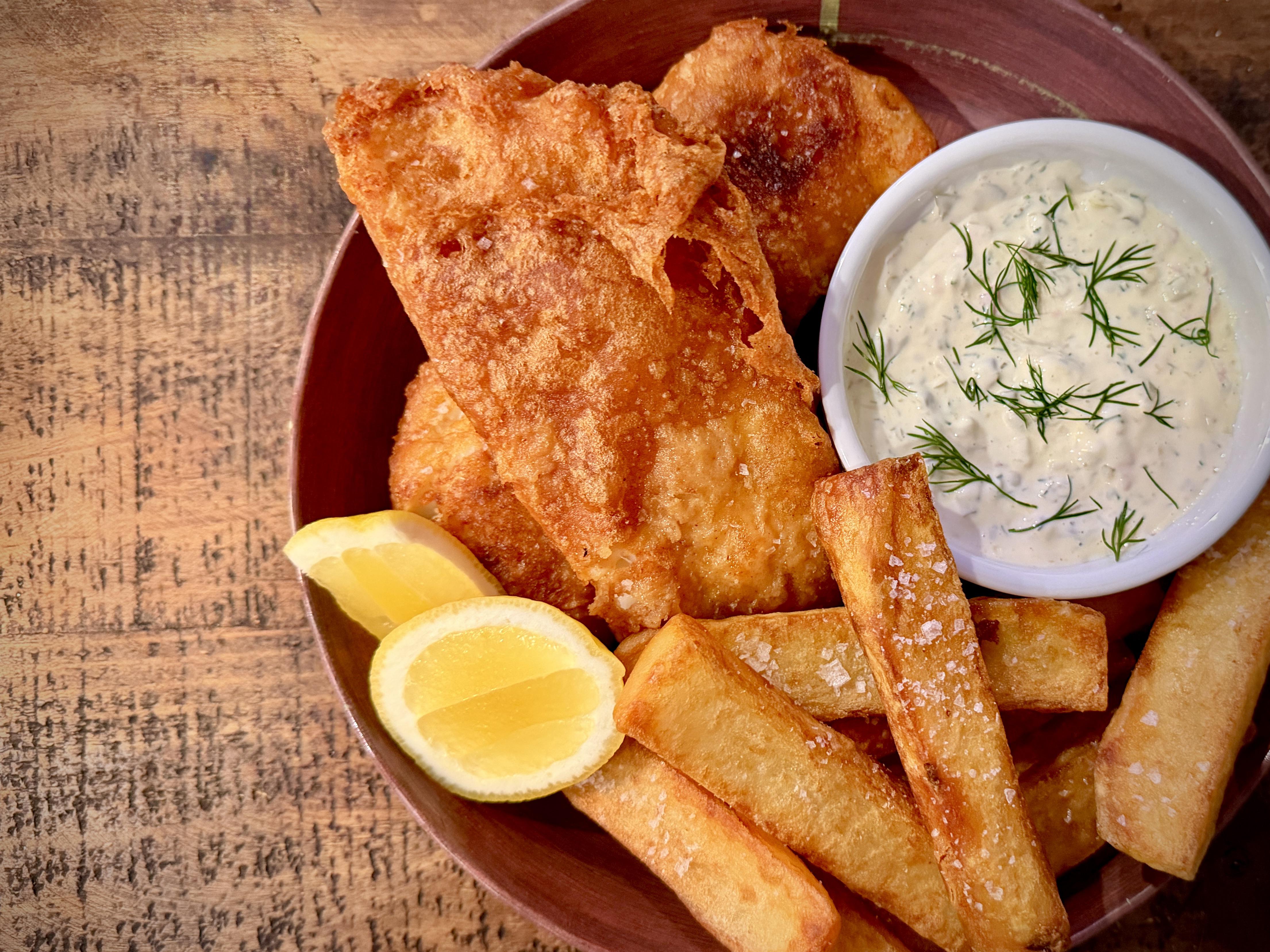 [Homemade] Beer Battered Fish and Chips, Homemade Tartar