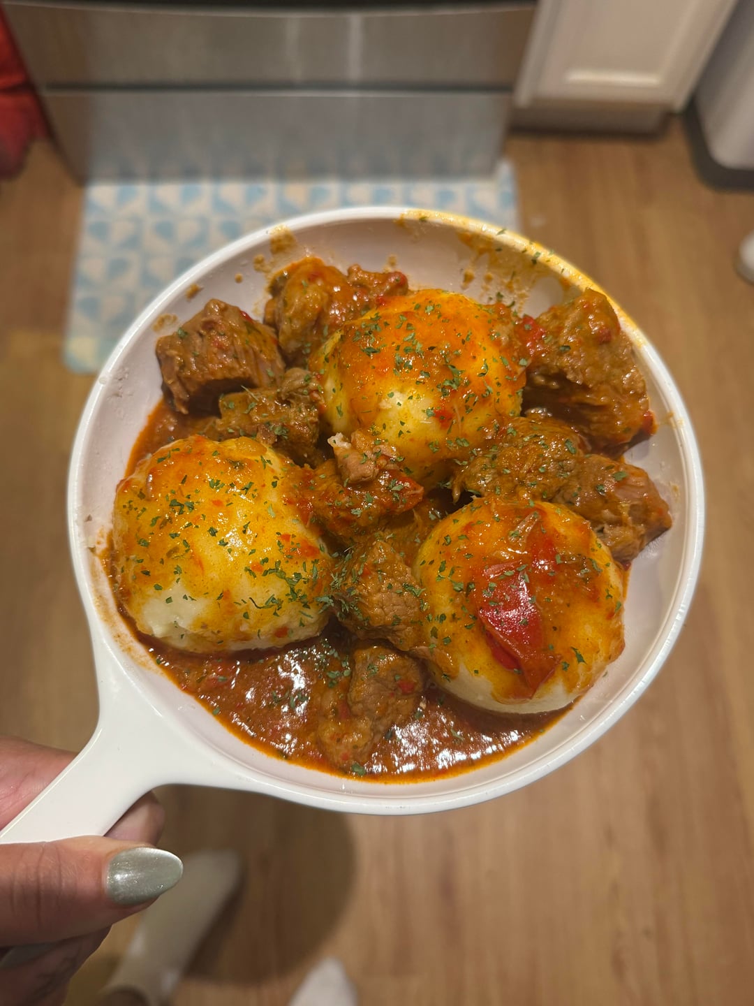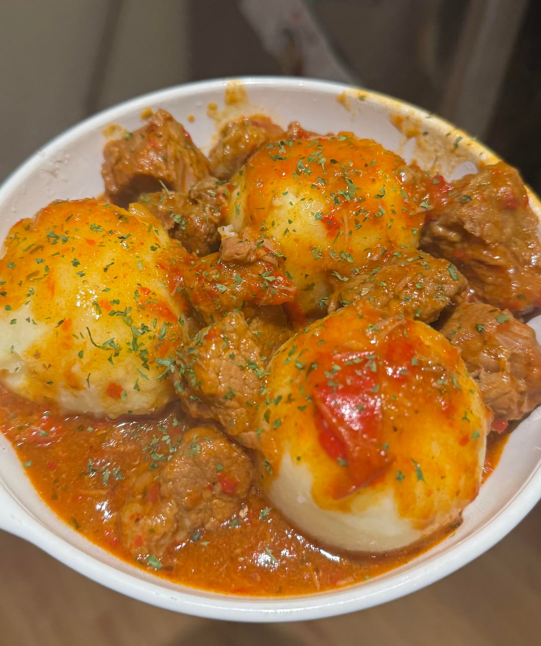 Aka goulash with potato dumplings. I was an aupair for a German family and they made this once a month regardless of weather. They served it with a with creamy white cabbage dish but I have yet been able to recreate that part. My host mom is protective and I changed families halfway through so getting the recipe from her is not possible 😅
