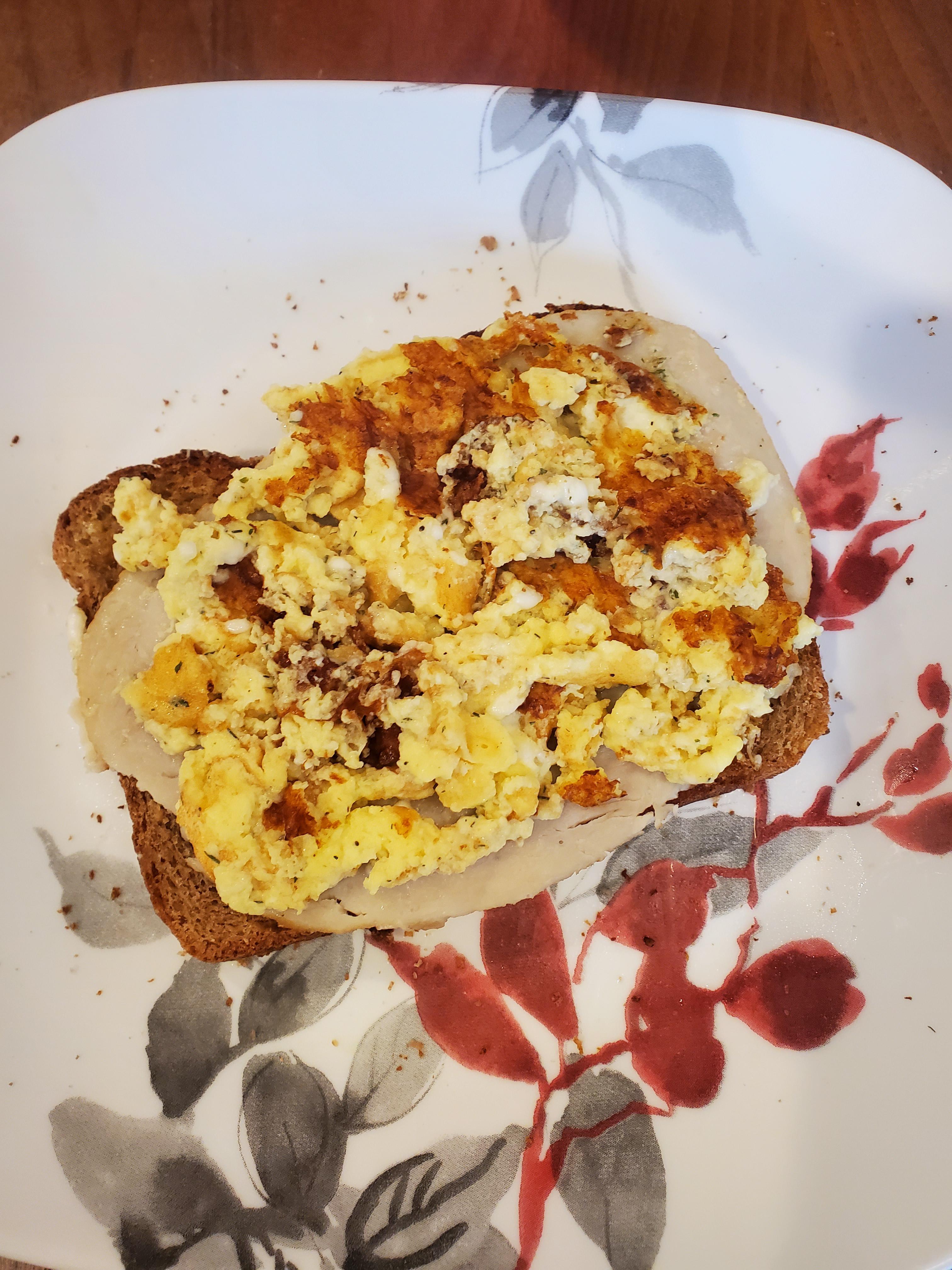 I mixed cottage cheese with an egg, added dill, parsley, garlic powder, onion powder, salt and pepper. Cooked it in a frying pan, then very briefly heated a slice of turkey with it. Toasted and lightly buttered the bread. (honestly I didn't even taste the butter, so I'll probably just leave it off next time). Very filling!