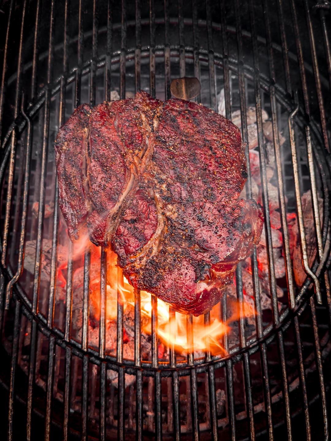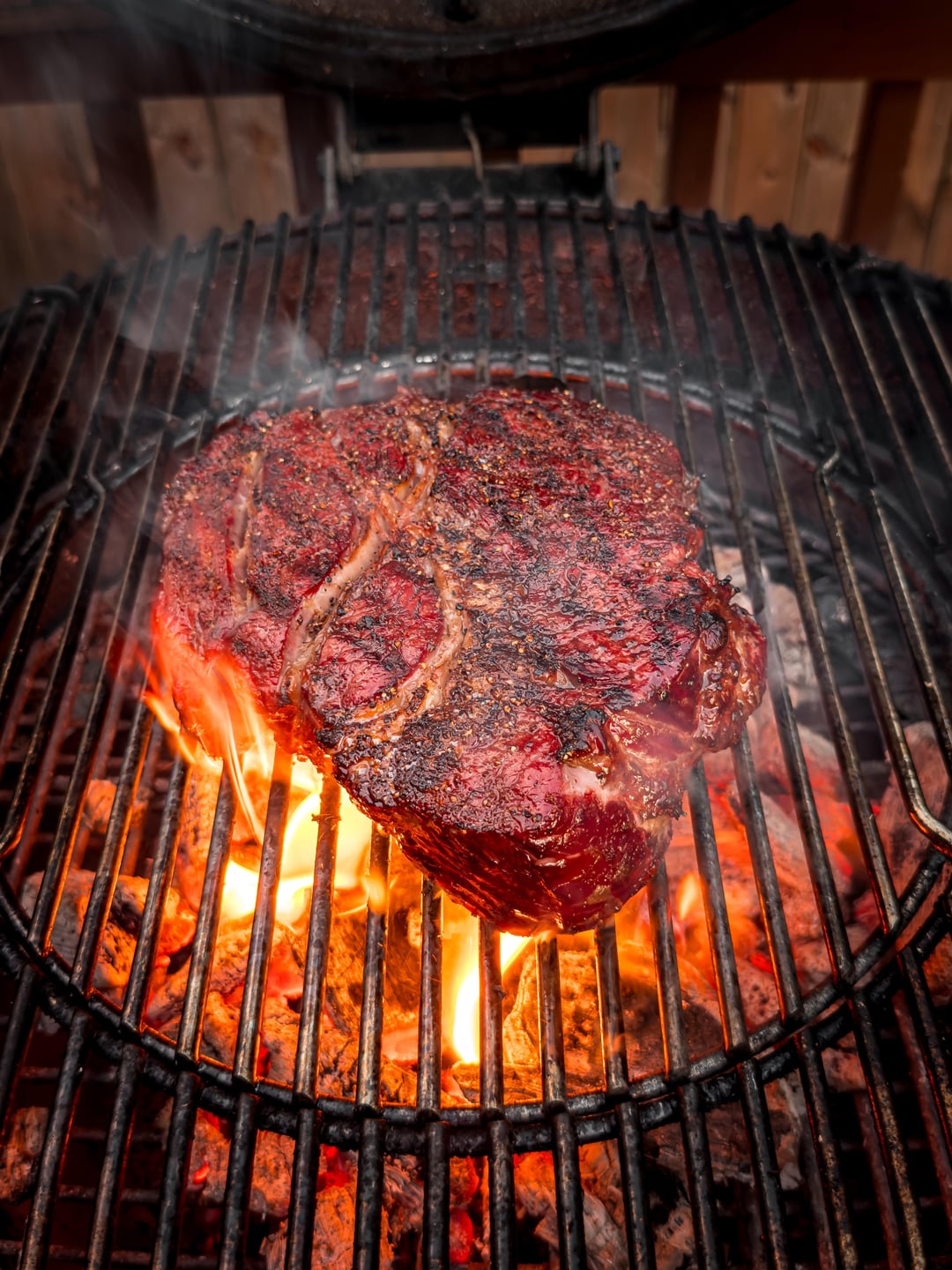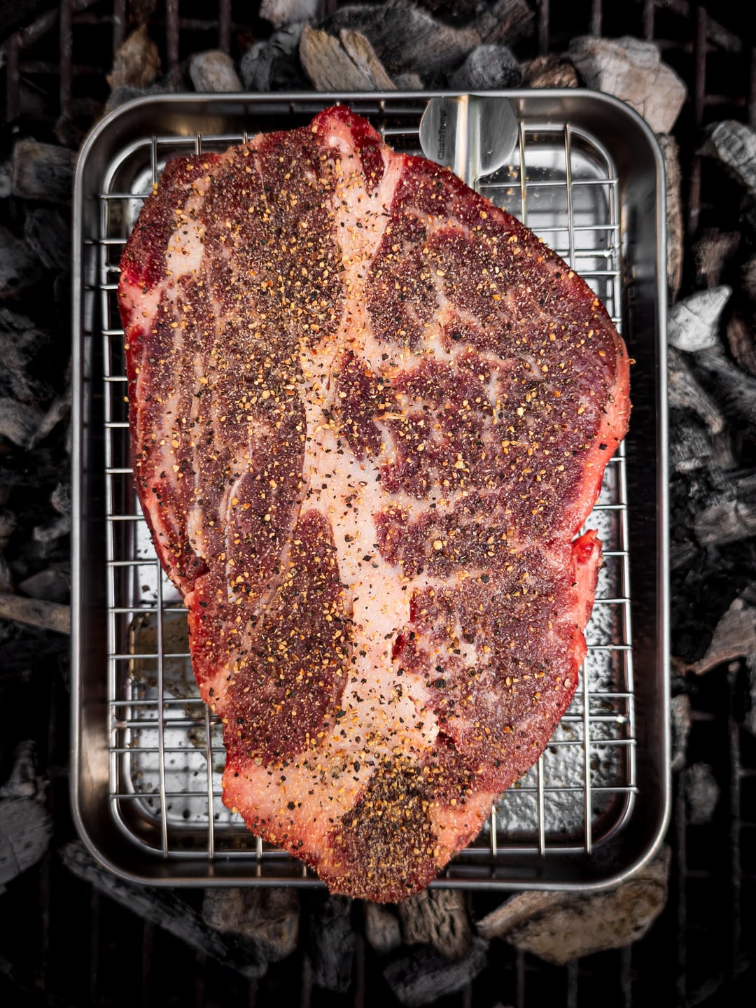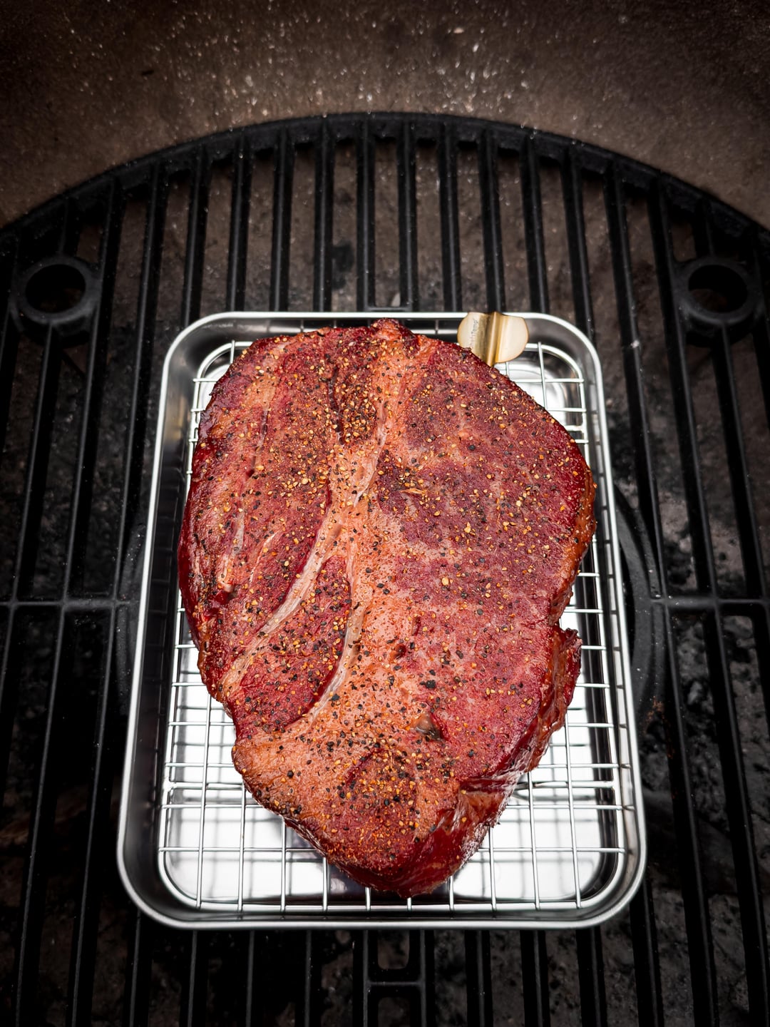 This chuck roast came out like butter. Smoked with hickory at around 175F for just a bit over 2 hours to an internal temp of 120F. Then seared over charcoal for a total of 4 minutes, flipping every 30 seconds. Peak temp during the rest came to 136F.