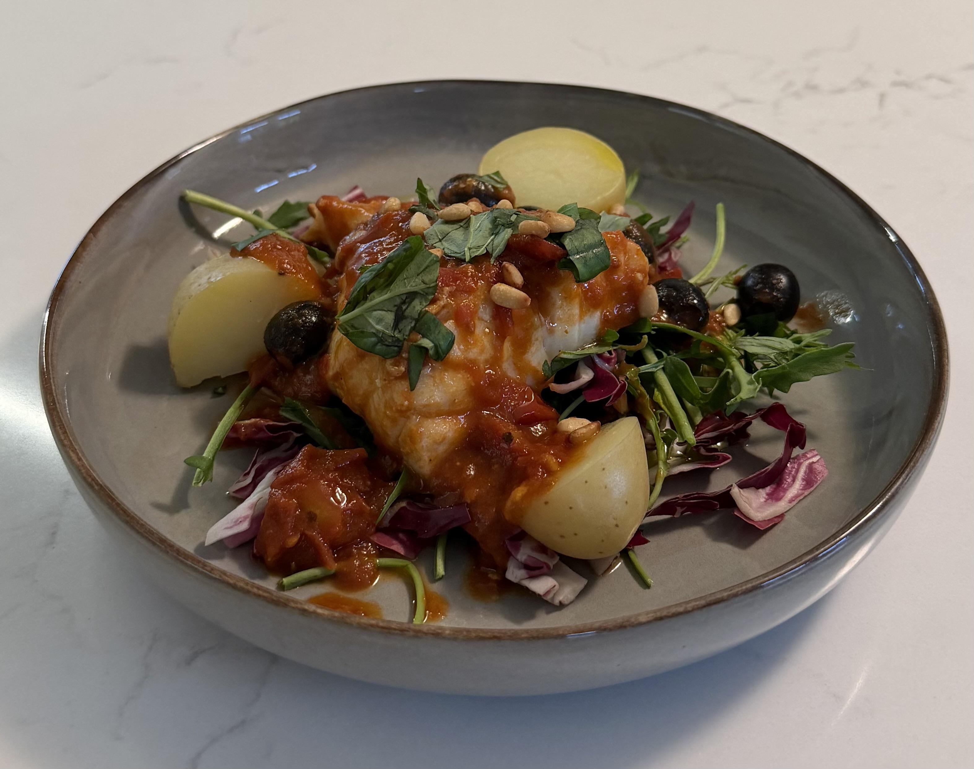 Slow cooked cod with putanesca sauce – boiled potatoes – radicchio – rucola and olives by Umbroraban Dinner Tonight Tonight's Dinner