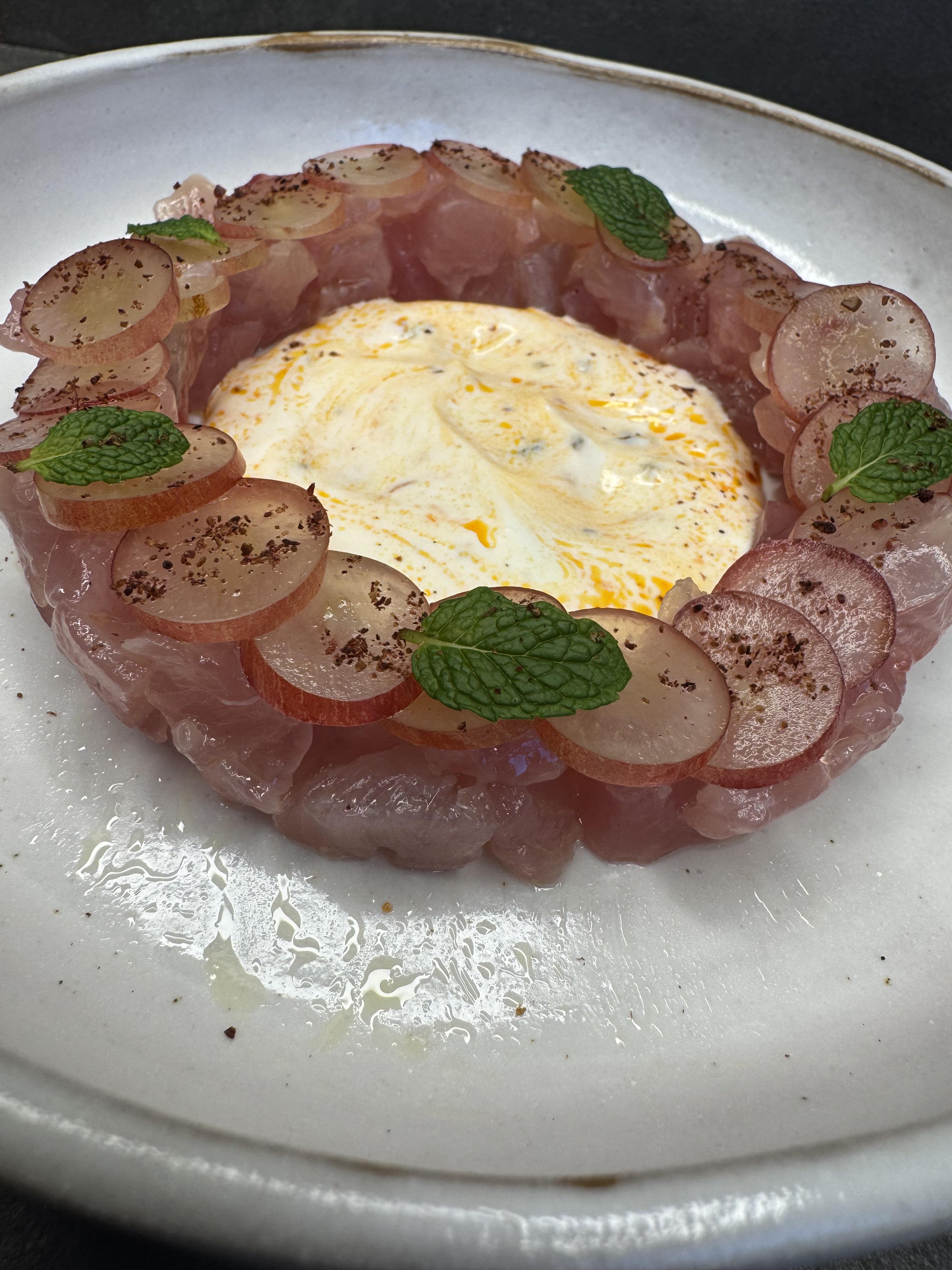 Bonito dressed in yuzu vinaigrette with pickled grapes, mint and chilli crunch yoghurt by Huntfishgrowcook Food Porn