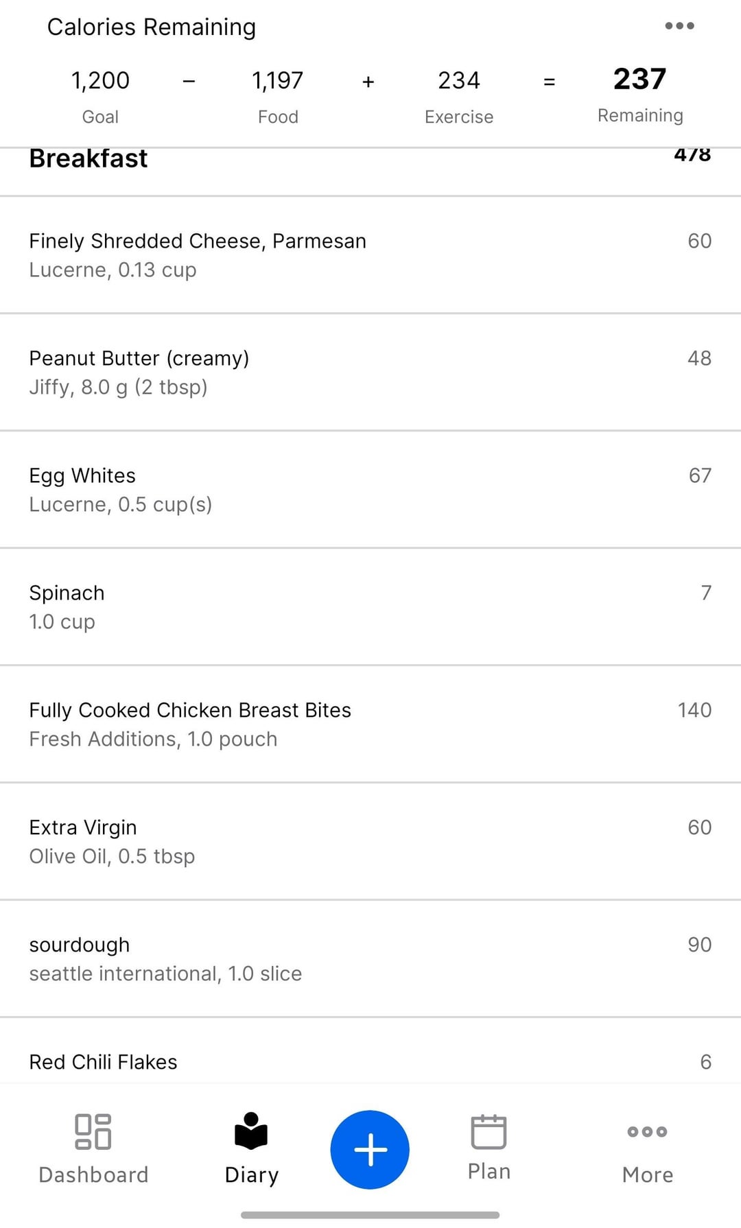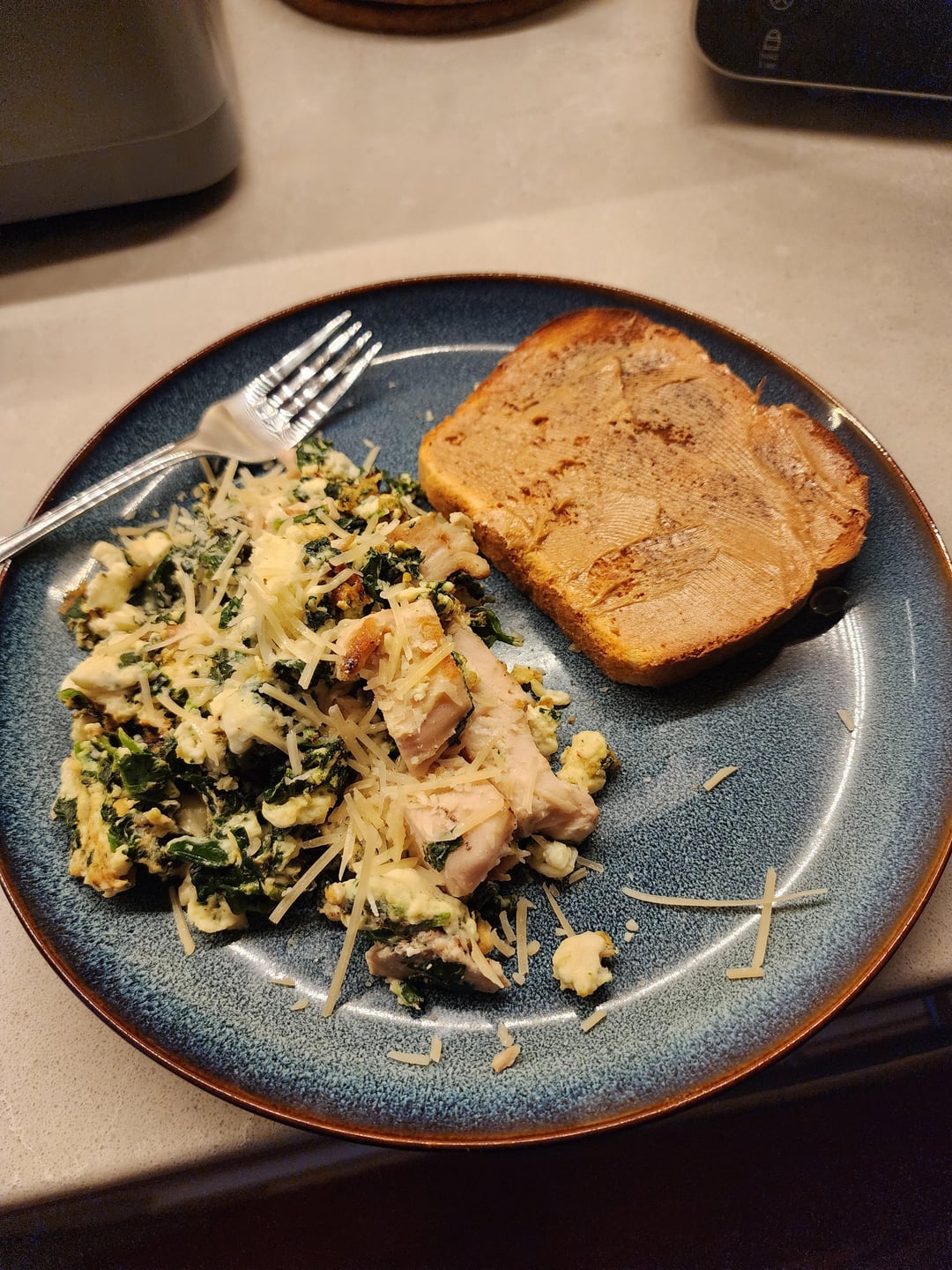 Meal 1 – egg whites, Costco portioned prepackaged chicken breast, frozen spinach, parmesan cheese + red chilly flakes on top. Serve with one piece of sourdough toast and a light spread of peanut butter.