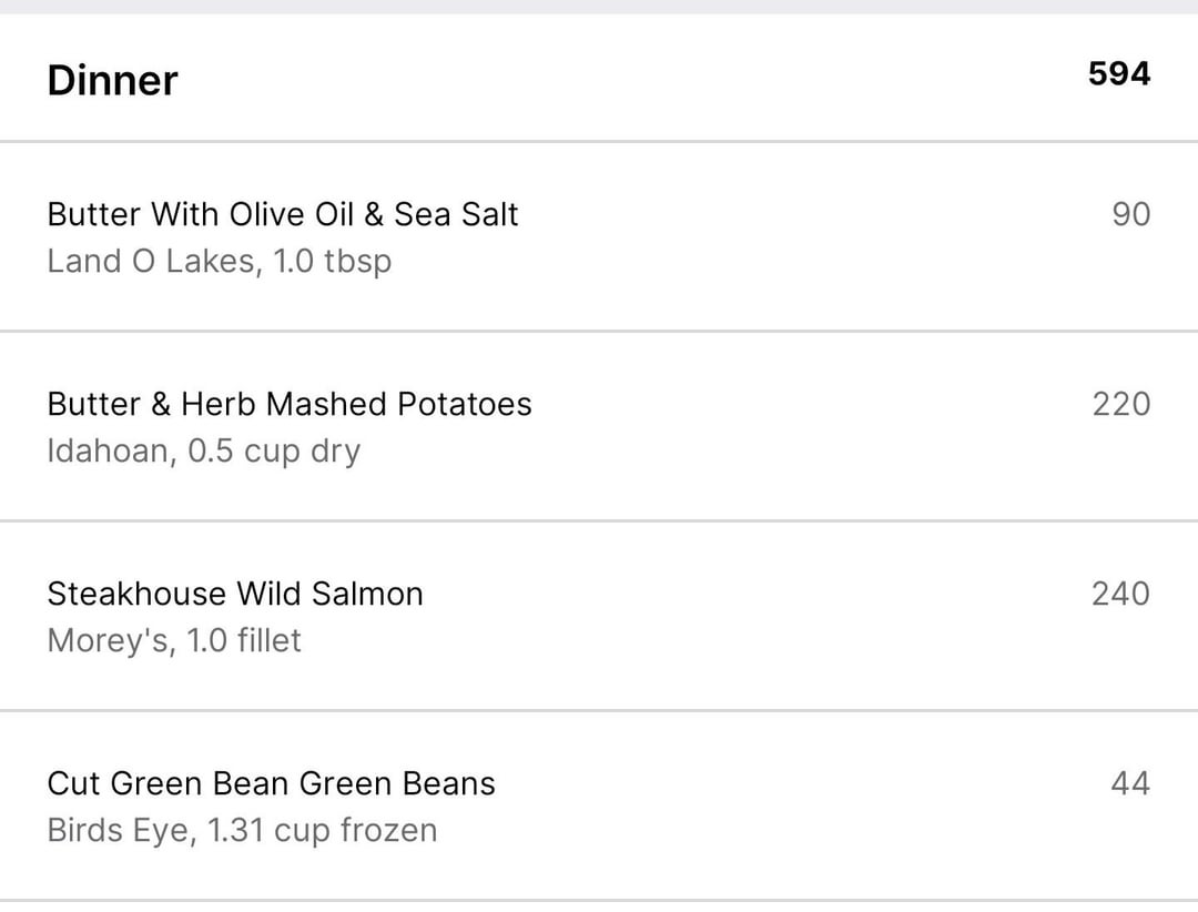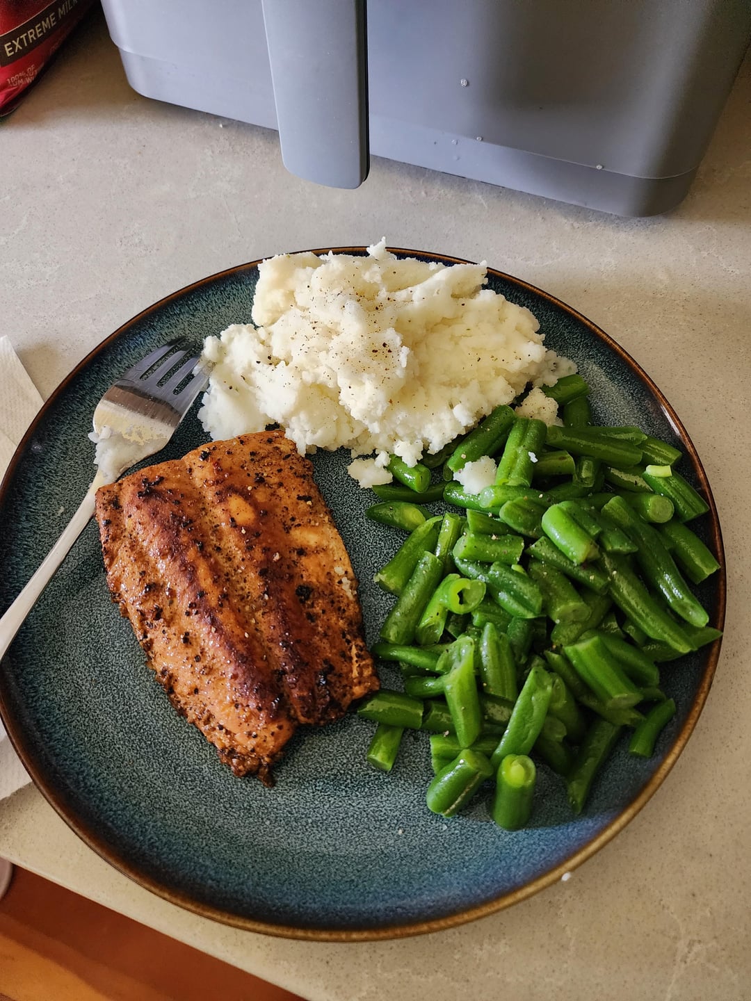 Meal 3 – Frozen prepared fish at Safeway (Salmon today) + frozen microwave veggies (green beans today) + powdered mash potato that I microwave too