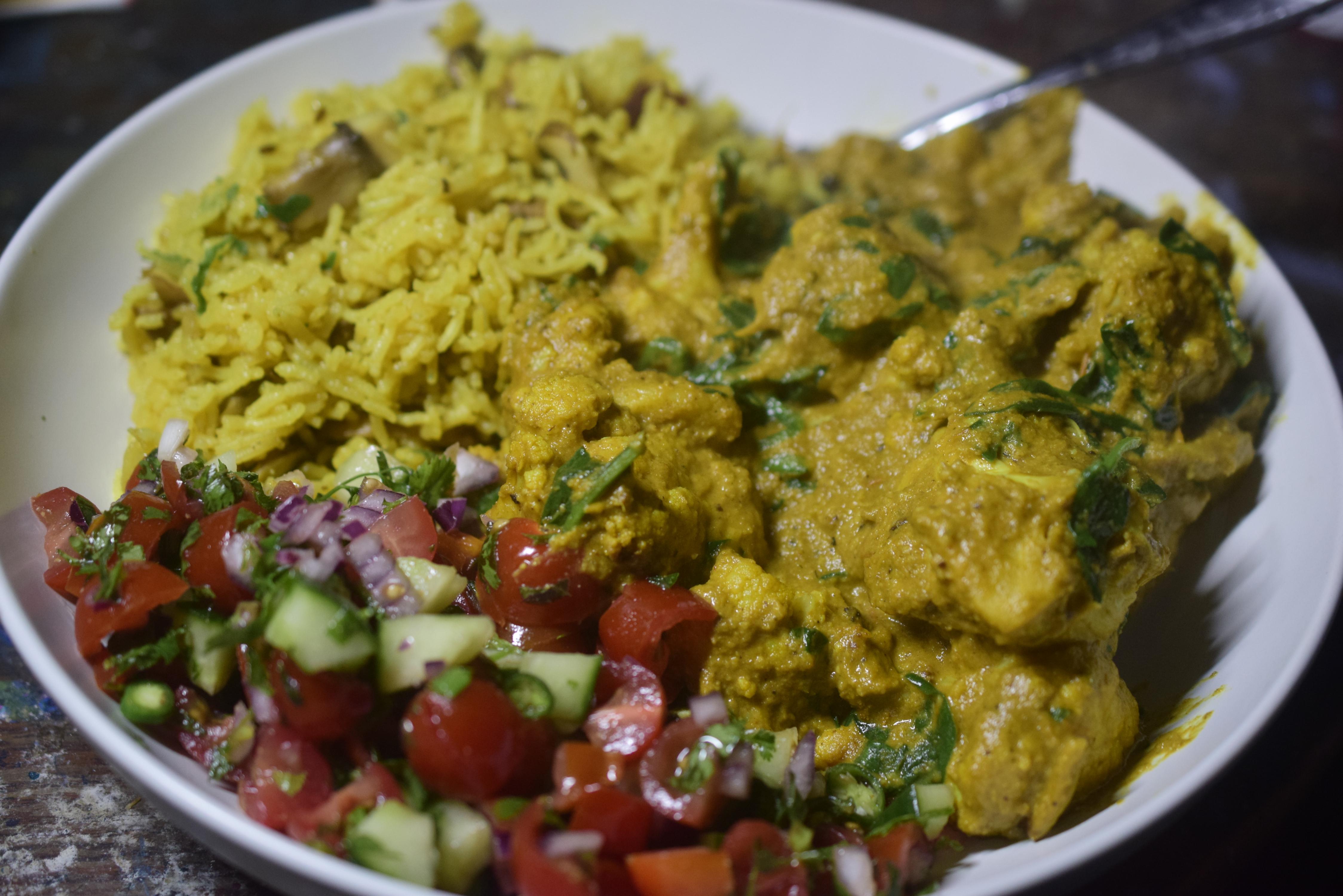 Roasted cauliflower and spinach curry in a cashew gravy with mushroom pilau and kachumber. Absolutely delicious. by whateverartisdead Food Porn