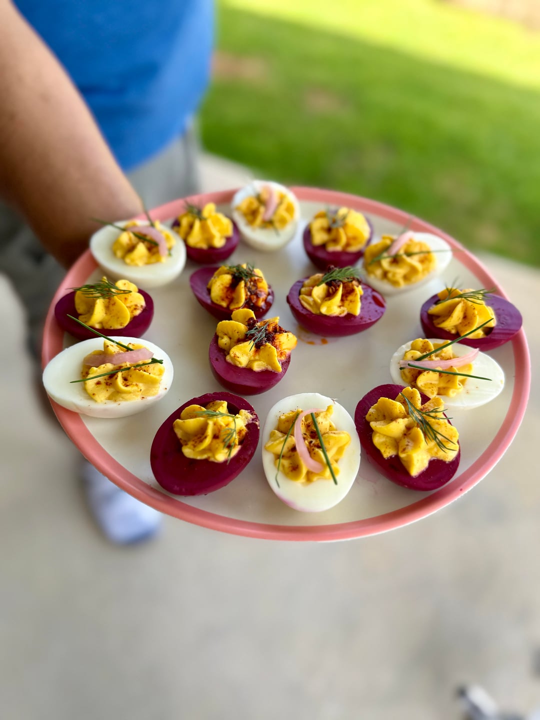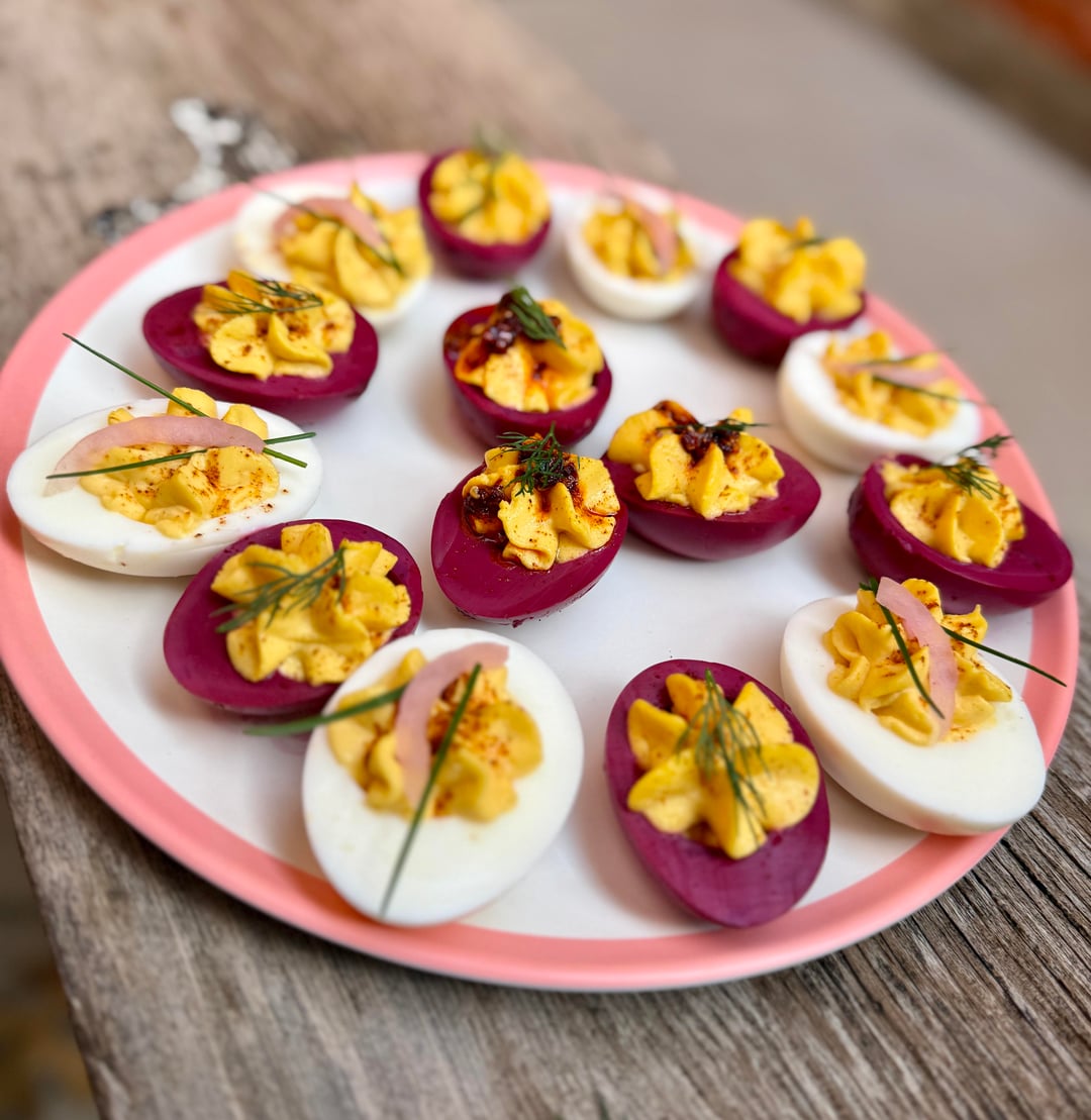 Make these every couple of years around Easter. The eggs whites are soaked in pickled beet juice overnight. I added chives, dill, homemade pickled red onions, and chili crisp (assorted).