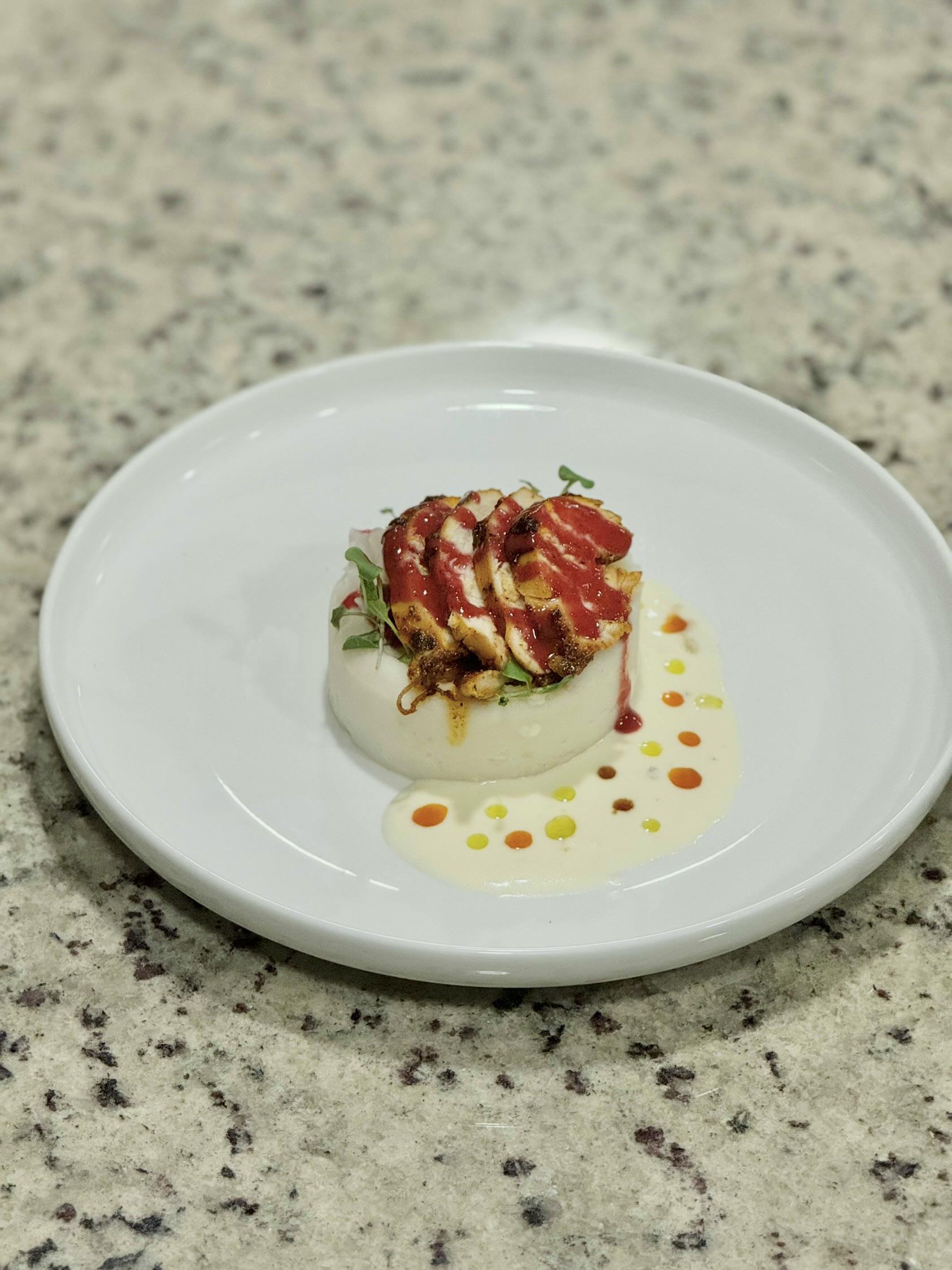 It’s like the sauce on the side looks so refined but the stuff in the middle just isn’t quite there yet. The amount of potato to chicken is way skewed unless there’s a secret thing hiding in the center (which would be super cool) and the cut and sauce on the chicken seems super amateurish. Great start though, if this is a breast maybe you can cut it right down the middle lengthwise and show off some nice crispy skin. Definitely on the cusp of greatness