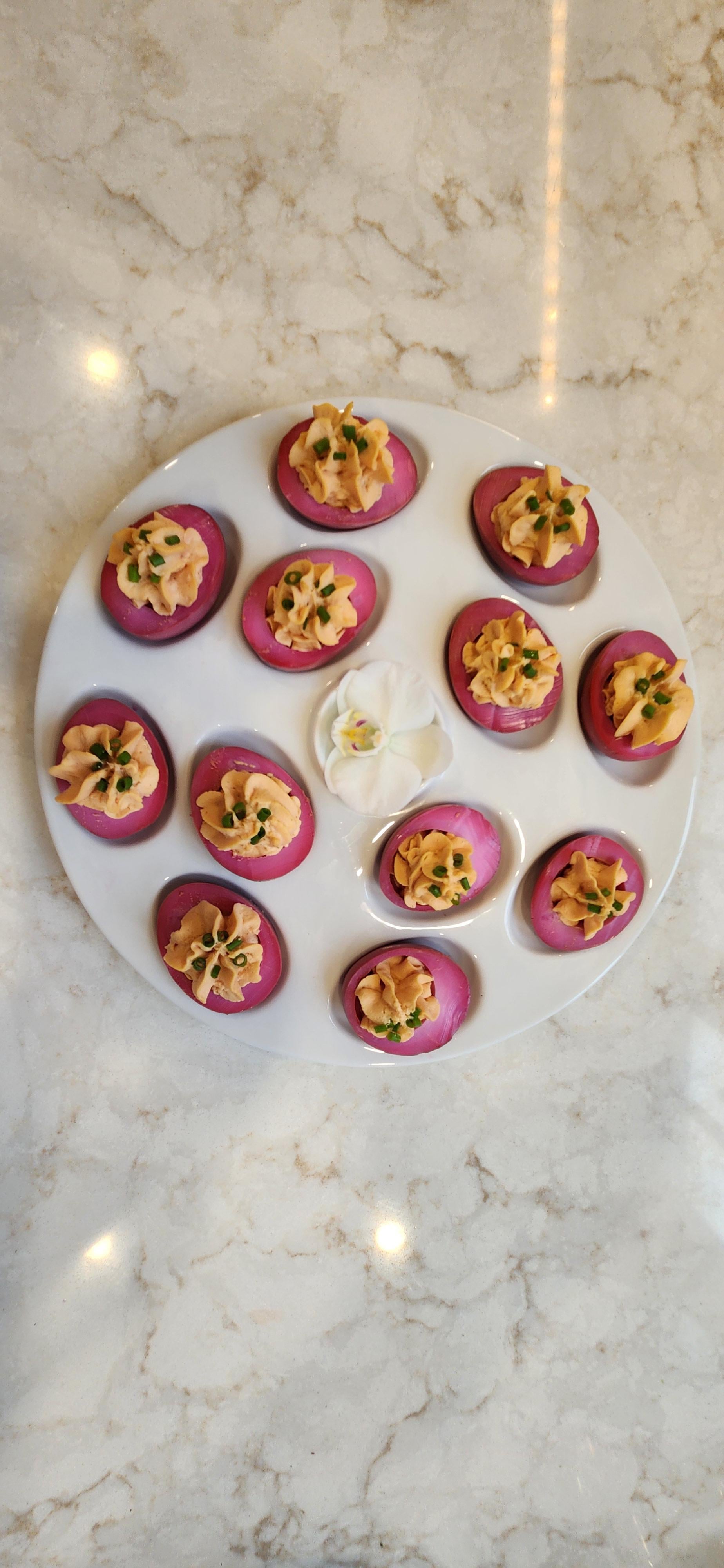 Beet borscht brine eggs, home grown and ground horseradish dollop under whipped egg yolk, mayo, mustard, white pepper, and salt mix. home grown chives tweezer placement garish with an Orchid flower center piece by Klutzy_Celebration80 Food Porn