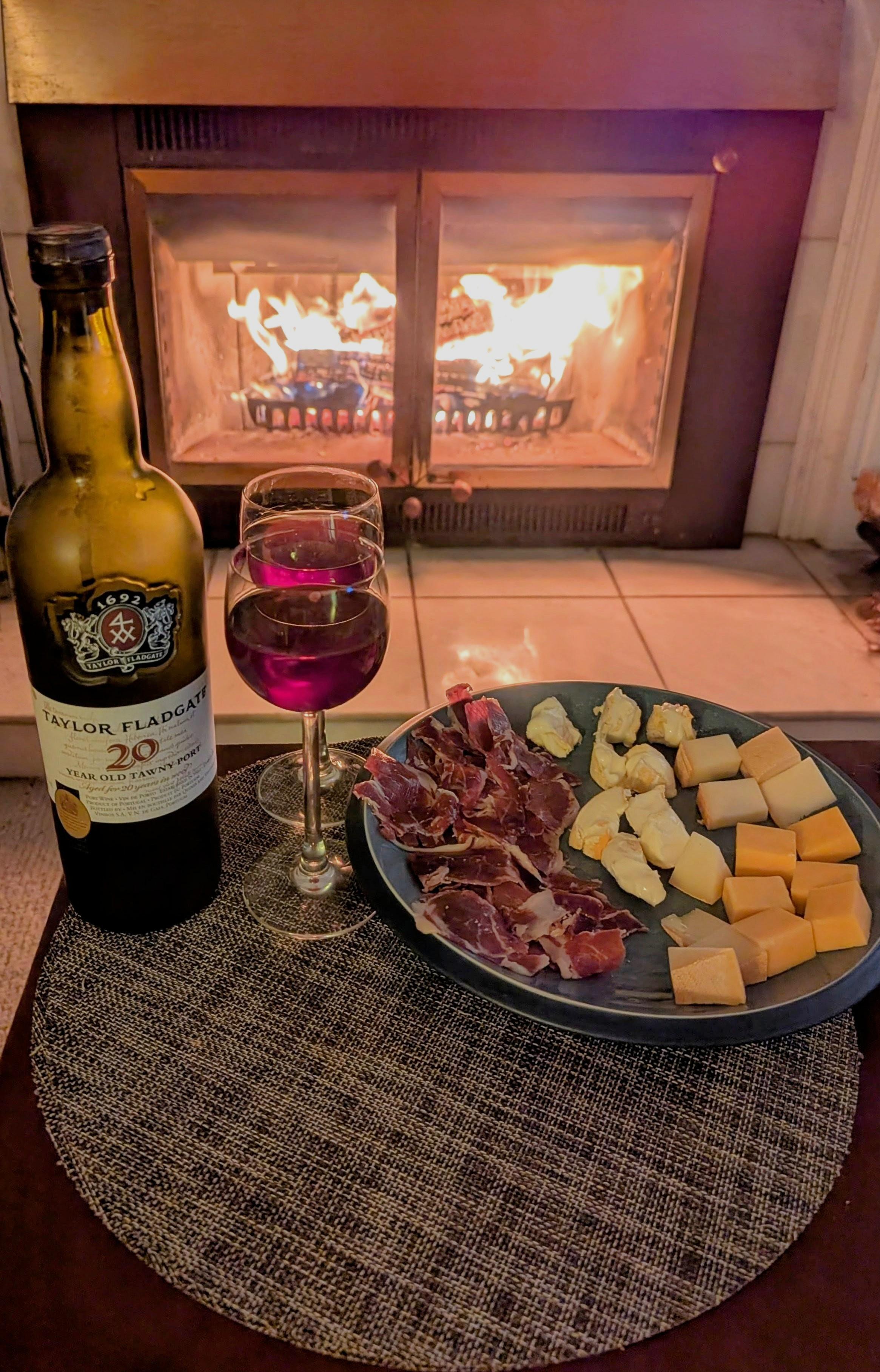 Fireside tawny port w/ carved Monte Nevado Spanish Jamón Ibérico de Bellota (aged 48 months minimum) & Vacherousse d’Argental / Oka / aged cheddar cheese [OC]