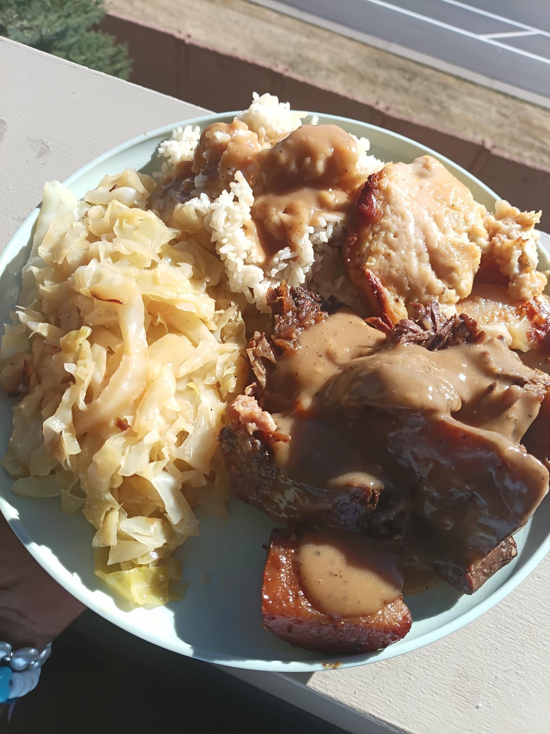 Gloomy_Caregiver_669 on April 5, 2026 10:46 pm Pot roast with potatoes and carrots Drippings gravy Potato Au Gratin White Rice (Not pictured) Cornbread Fried Cabbage Peach Cobbler