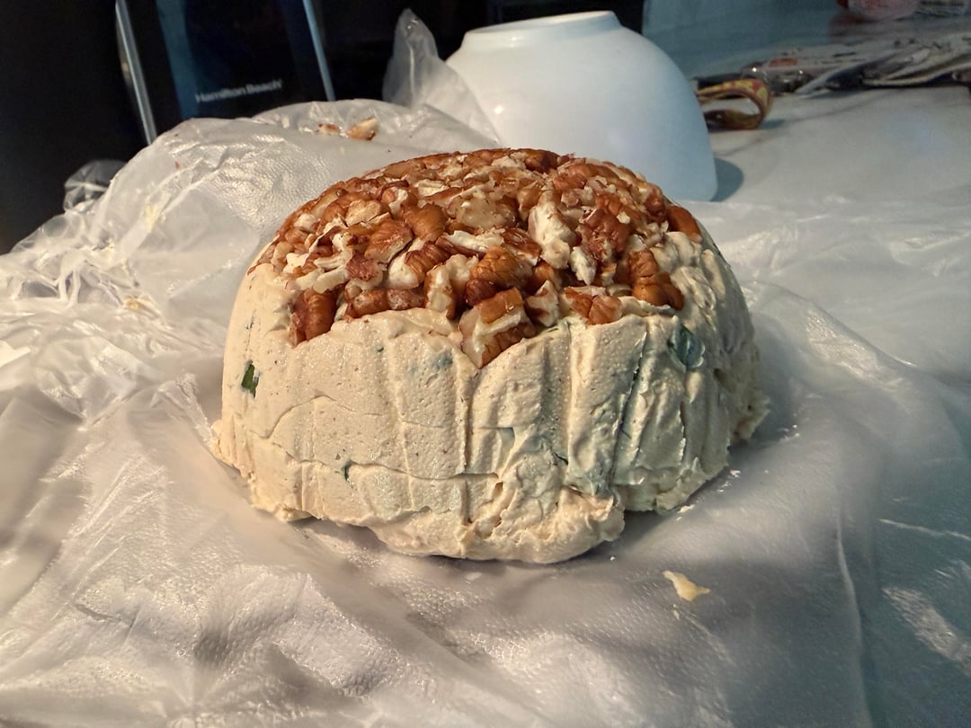 4. Line a small bowl with plastic wrap, sprinkle \~2 tbsp crushed pecans on the bottom, then pack in the mixture and shape.