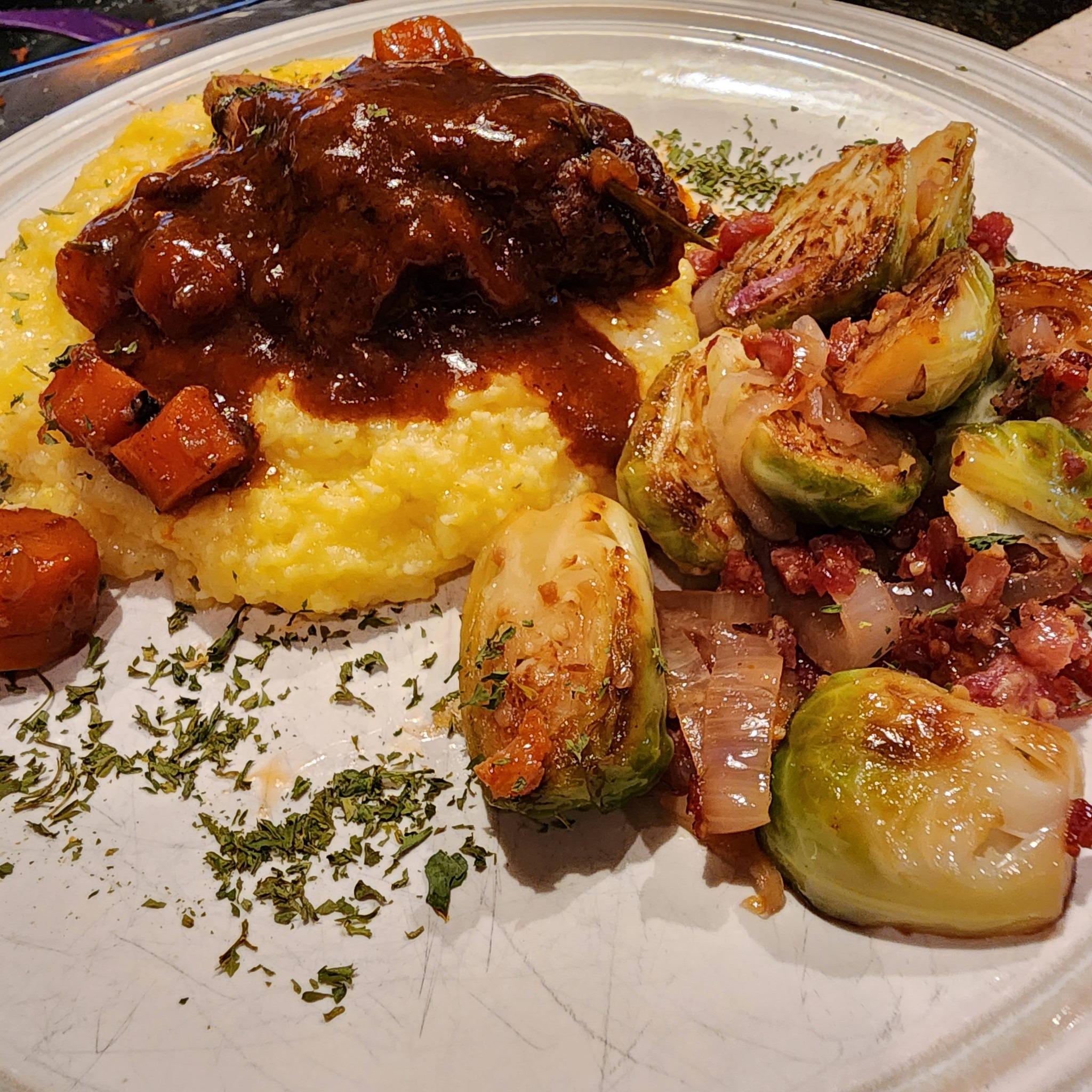 Braised short ribs on polenta, Brussels with pancetta for dinner. by LolAtAllOfThis Dinner Tonight Tonight's Dinner