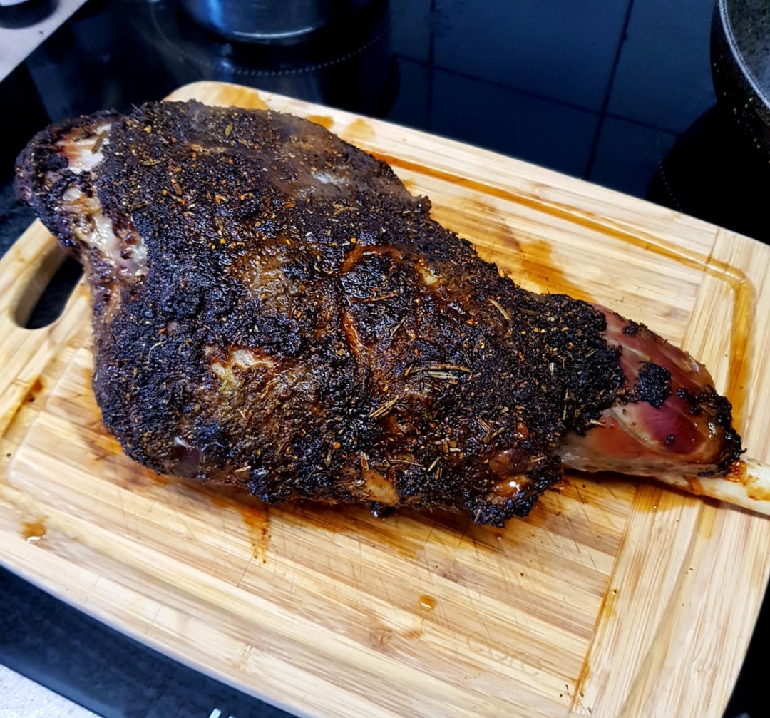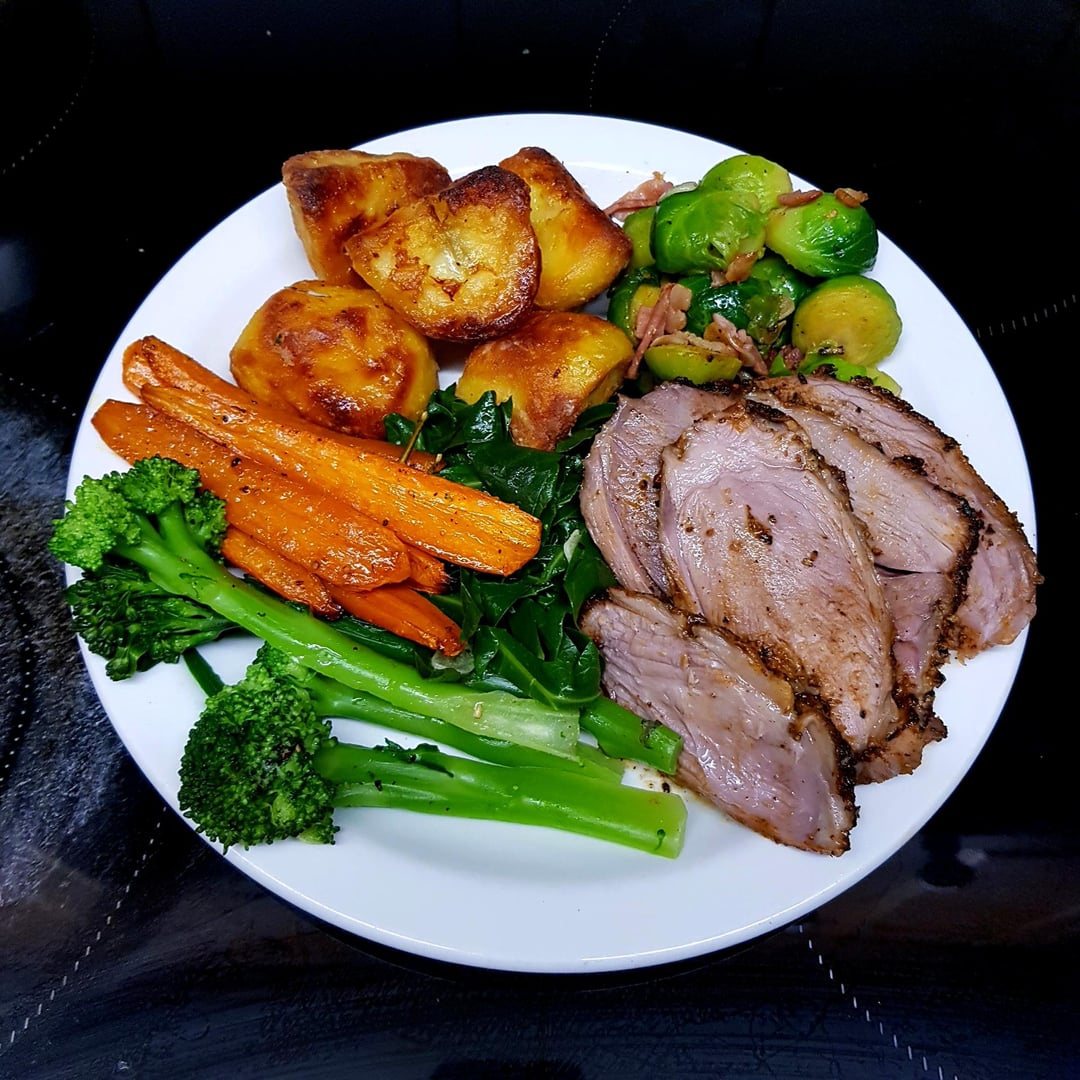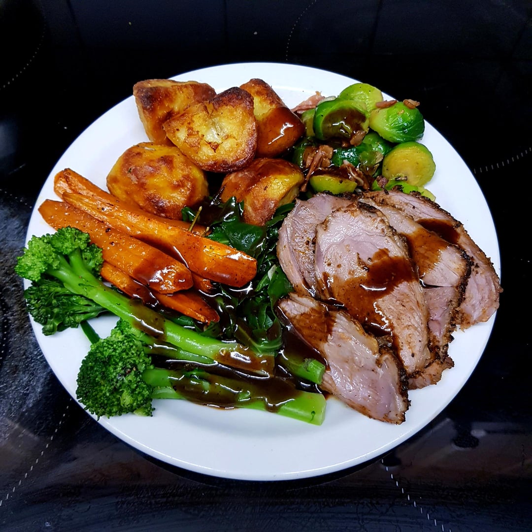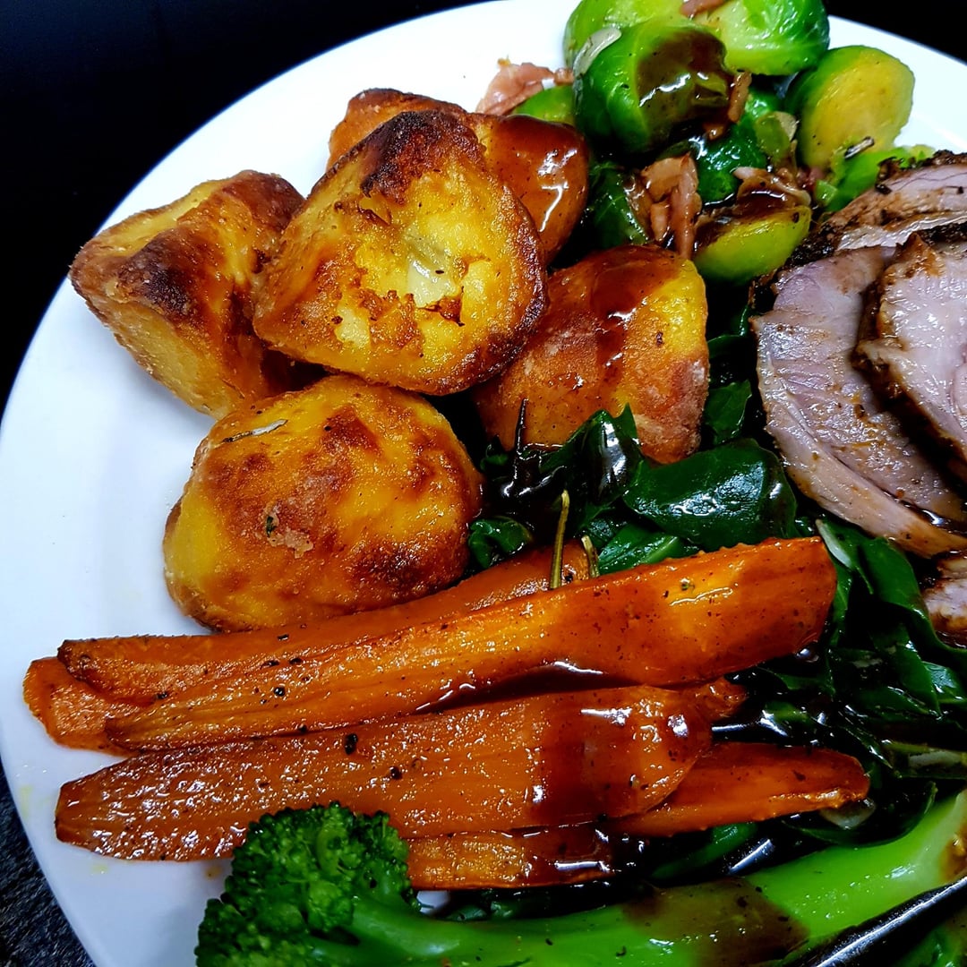 Easter Lamb Roast, Duck Fat Potatoes, Sprouts with Bacon, Garlic Spring Greens, Buttery Broccoli and Glazed Carrots. Red Wine Pan Gravy.