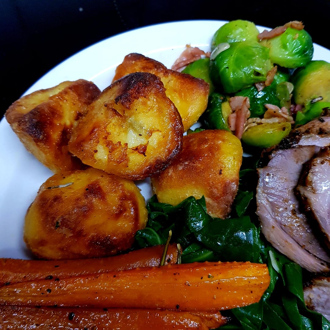 Easter Lamb Roast, Duck Fat Potatoes, Sprouts with Bacon, Garlic Spring Greens, Buttery Broccoli and Glazed Carrots. Red Wine Pan Gravy. by pink_flamingo2003 Dinner Tonight Tonight's Dinner