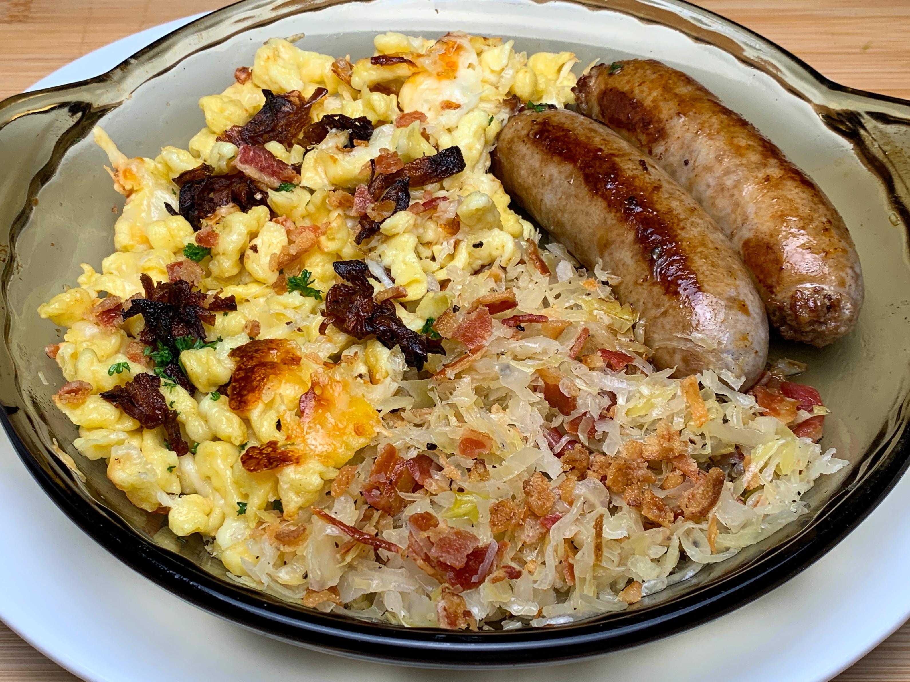 Bratwurst, Sauerkraut fried in duck fat with crumbled bacon and Kaesespaetzle