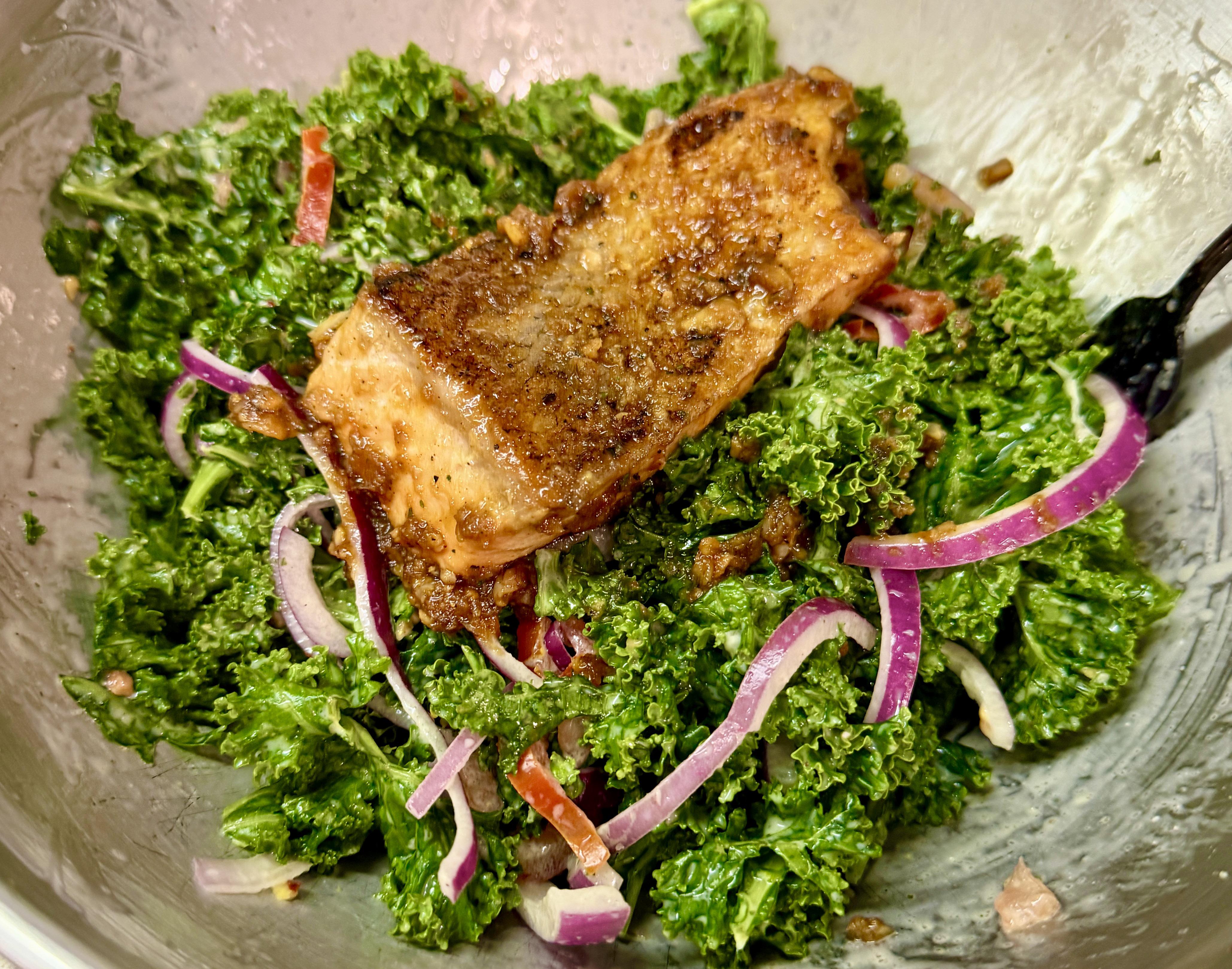 It’s 340 calories (338 calories, 25g protein, 14g carbs, 10g fat). 100g salmon (208 cal) 100g kale (50 cal) 50g red onion (20 cal) 50g Roma tomato (10 cal) 2 tbsp Bolthouse farms blue cheese dressing (50 cal) by Thin-Inevitable9759 1200 Calorie 1200 Calorie Diet 1200 Calorie Meal Plan 1200 Kcals 1200 Kcals a day 1200 Kcals per day 1200 Kilocalorie 1200 Kilocalorie a day 1200 Kilocalorie per day 1200isplenty
