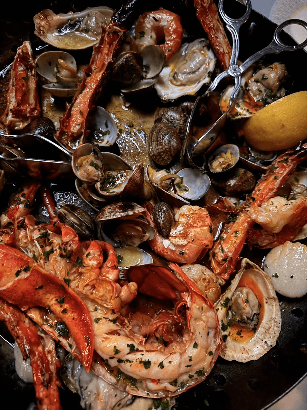 - Lobster: A large split tail and a whole claw dominate the foreground.