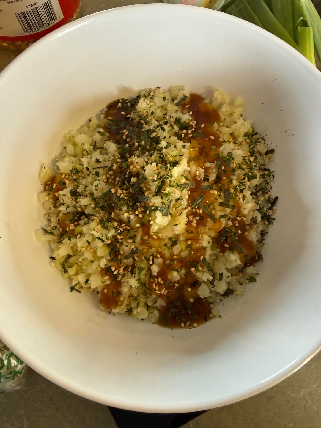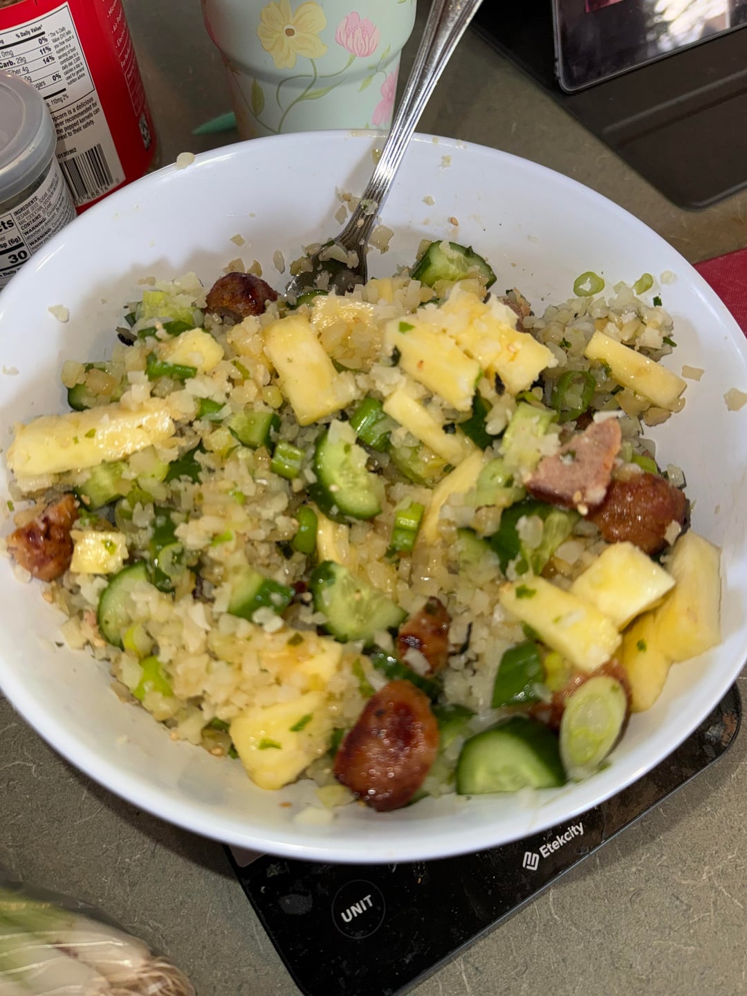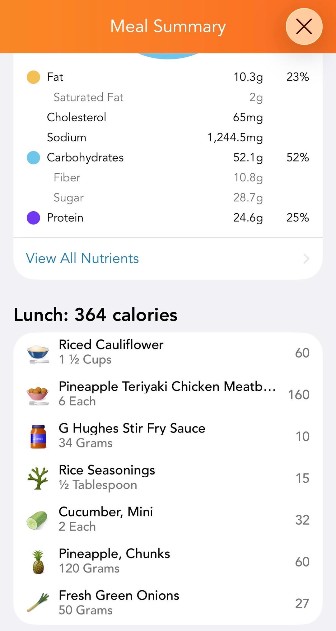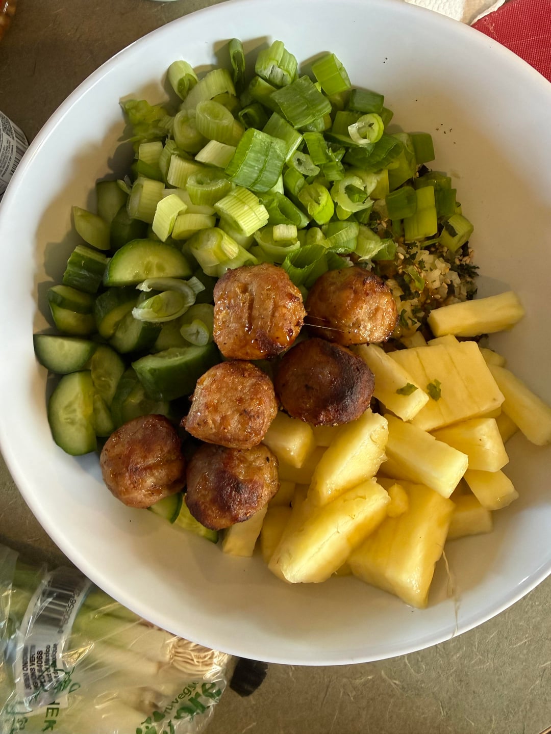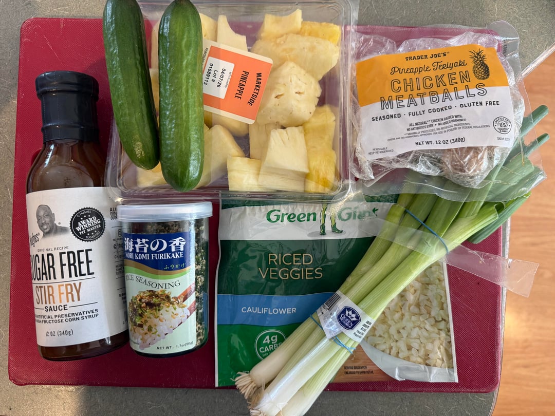 Pineapple Teriyaki Meatballs from Trader Joe’s , but I also do Real Good chicken meatballs when I can’t go all the way to our Trader Joe’s. I also increase the meat some days or add edamame or white rice if I want to add more on heavier work out days! Or I’ll do some bibigo mini wantons with them too!