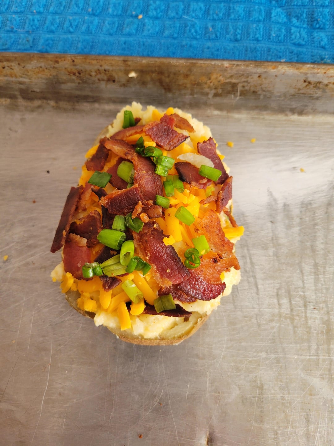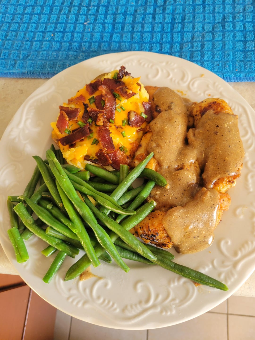 Basic dinner tonight. Made twice baked potatoes, steamed green beans and fried chicken tenders with pan gravy
