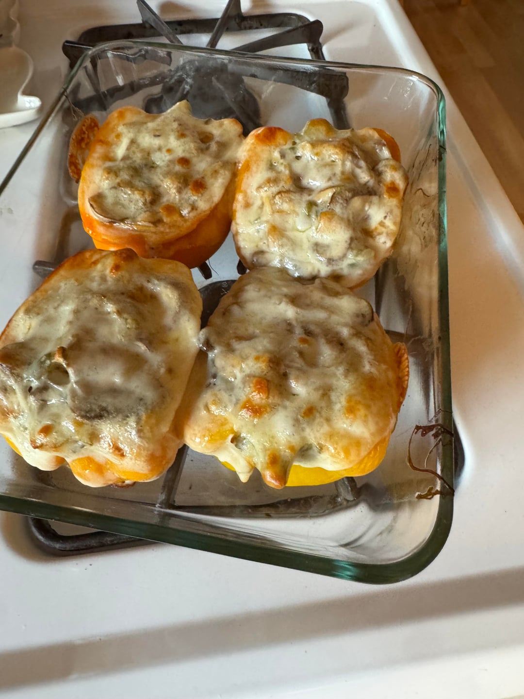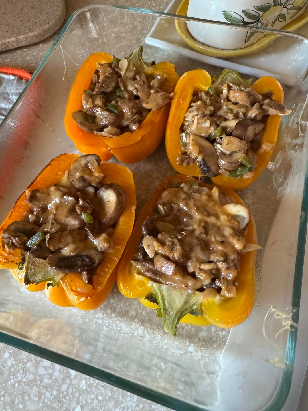 Bell peppers stuffed with skirt steak, mushrooms, onion, jalapeño and cheese. Topped with provolone. by TheBeavMSU Food