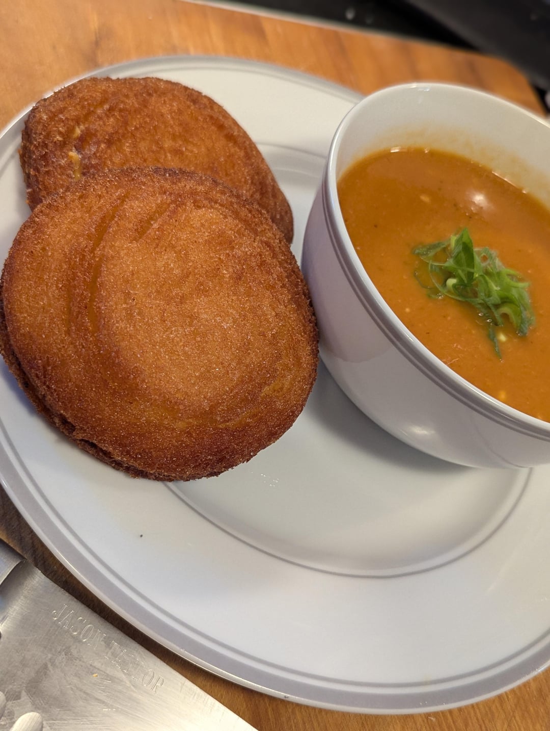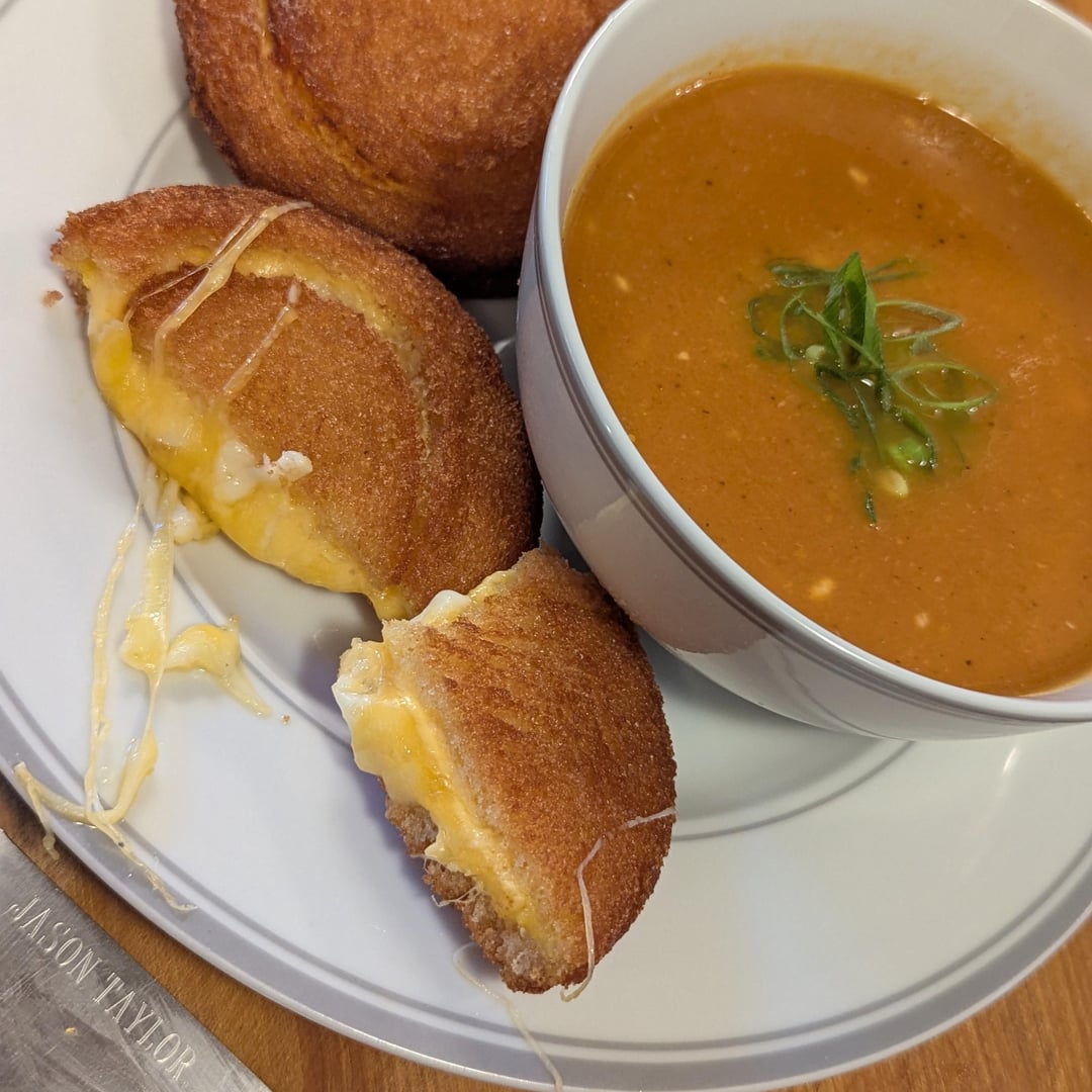 “Fancy Grilled Cheese” – Fried homemade Cheese Uncrustables (cheddar, American, & mozzarella) w/ Tomato, Onion, Sweet Pepper, & Horseradish Soup by ChefJayTay Dinner Tonight Tonight's Dinner