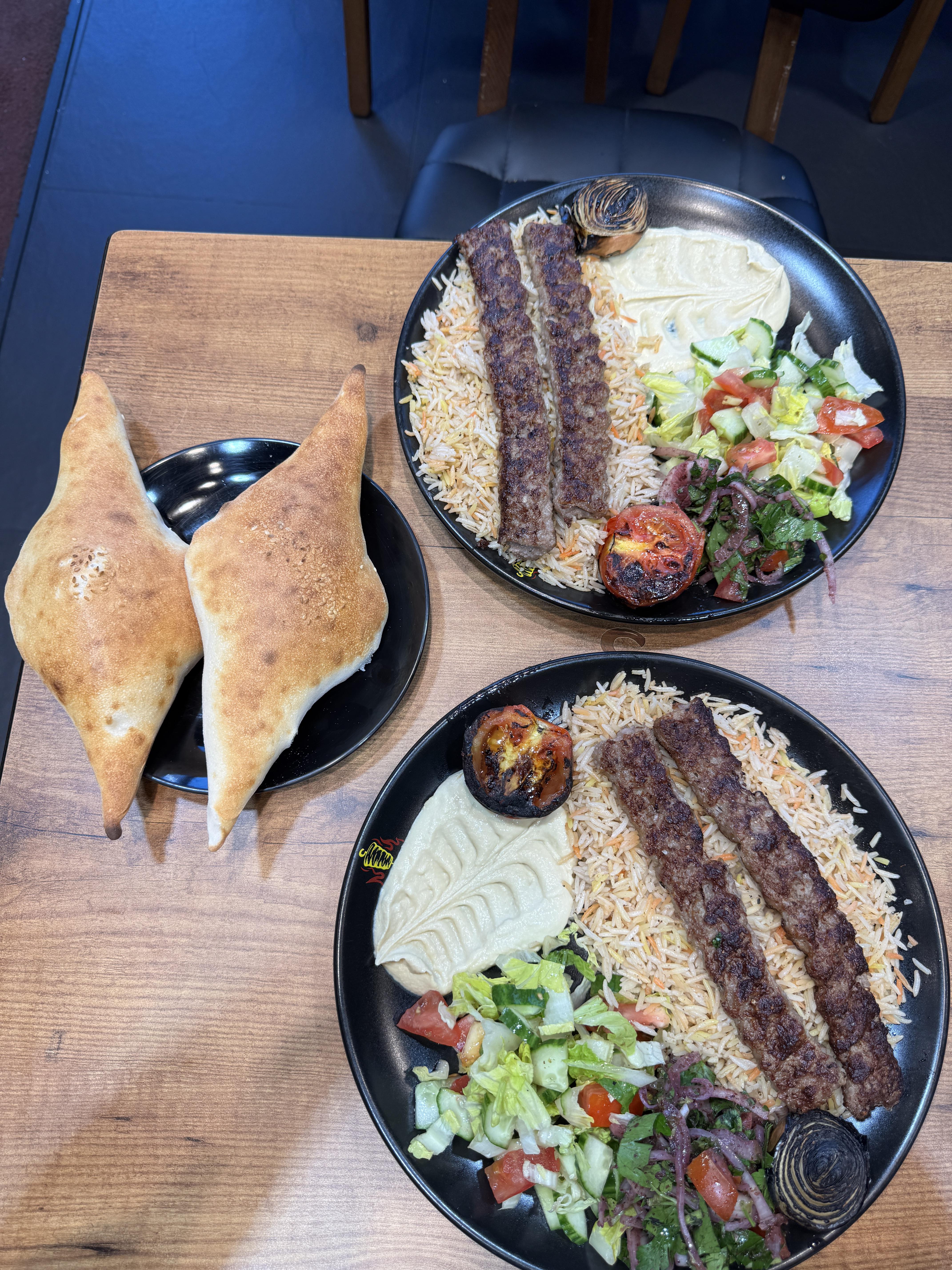 Knew it was iraq because of the diamond samoons. But rice under, humus on the same plate, and the tomato and onion burned, is this actually in iraq? Interesting.