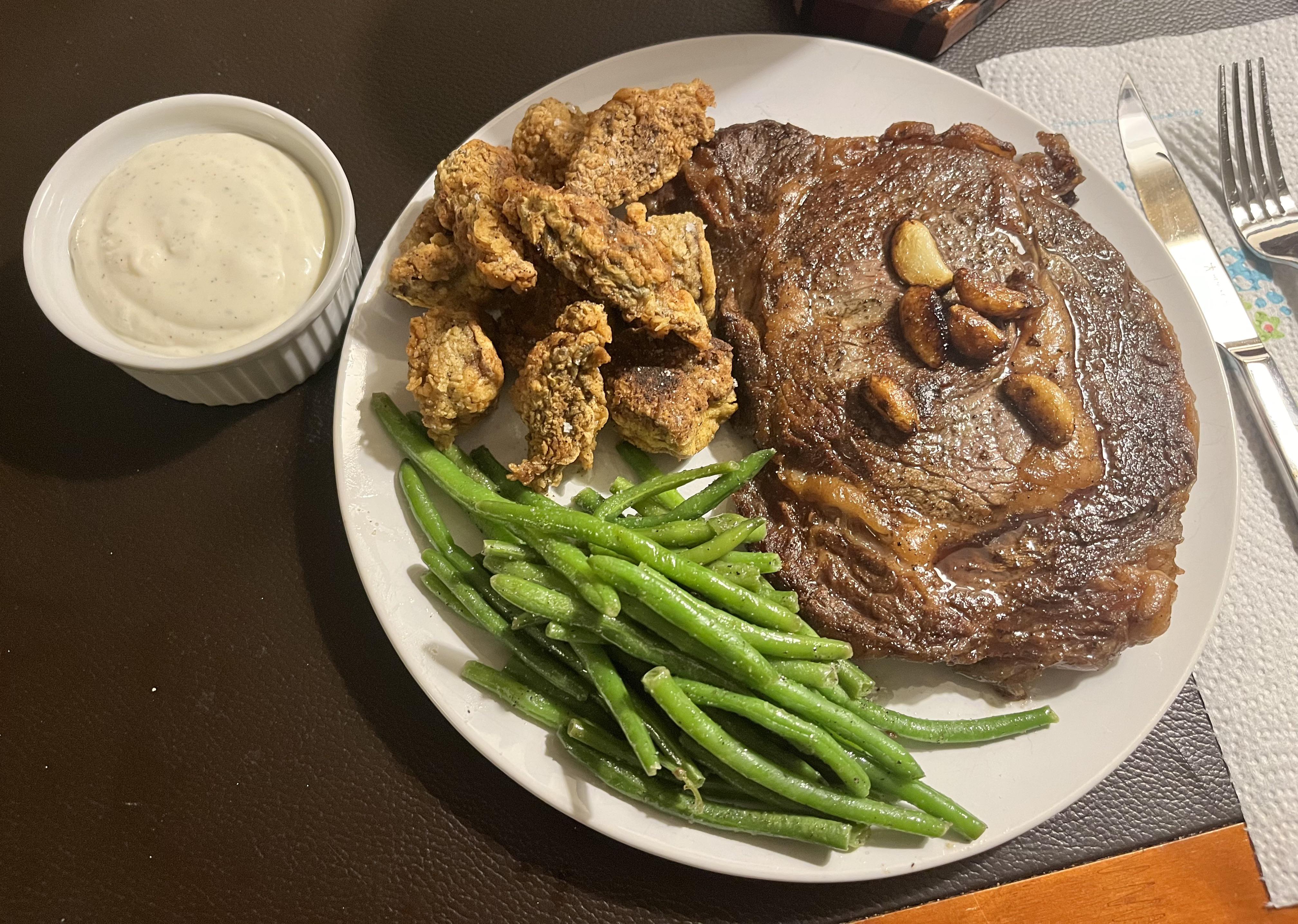Pan Seared Ribeye, sauteed green beans, fried morel and baby bella mushrooms, with a whipped goat cheese, fresh rosemary, truffle sauce on the side by Bethj816 Dinner Tonight Tonight's Dinner