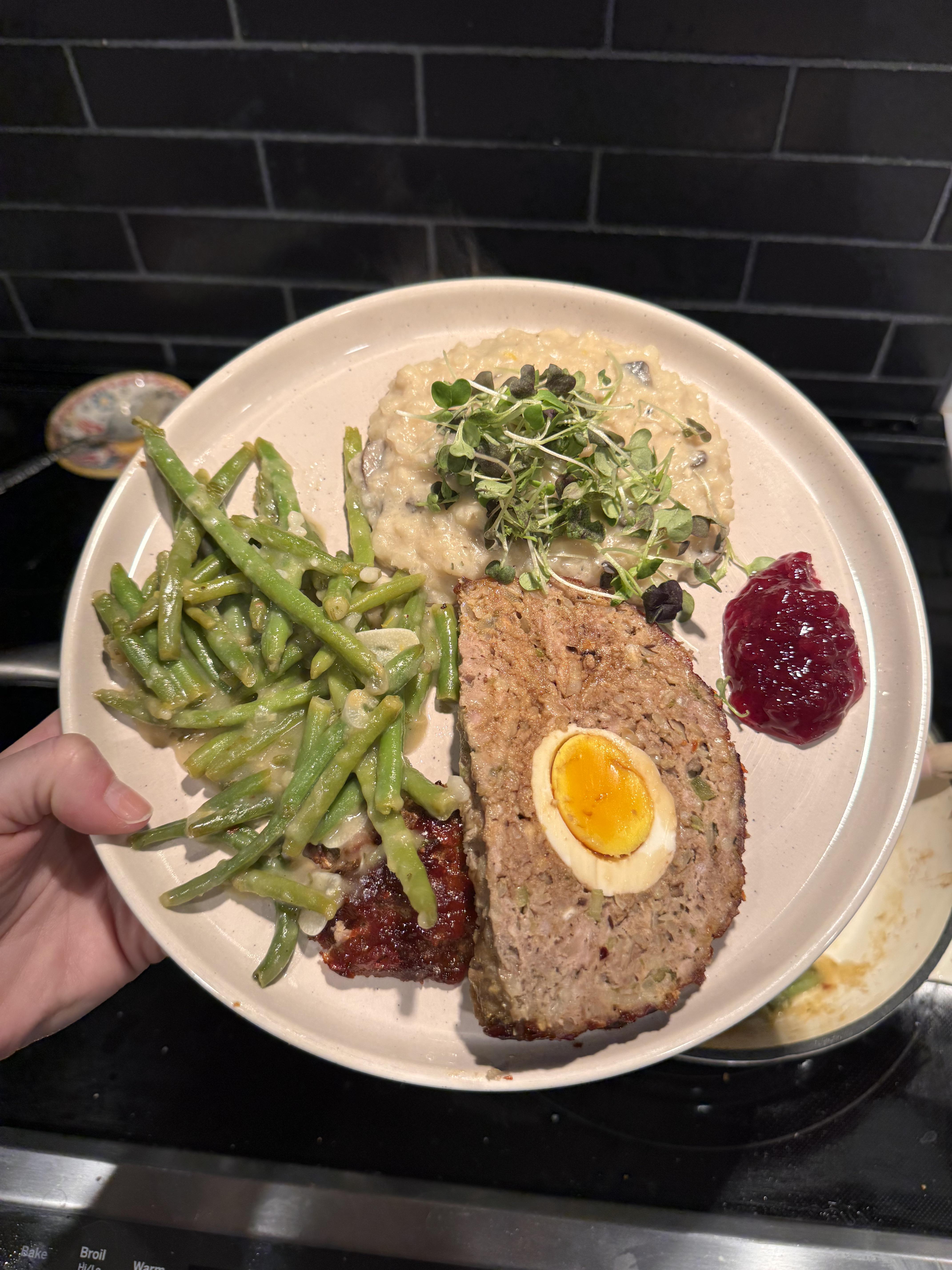 Egg stuffed meatloaf, lemon piccata green beans, truffle mushroom risotto with micro greens and lingonberry jam by kadick Dinner Tonight Tonight's Dinner