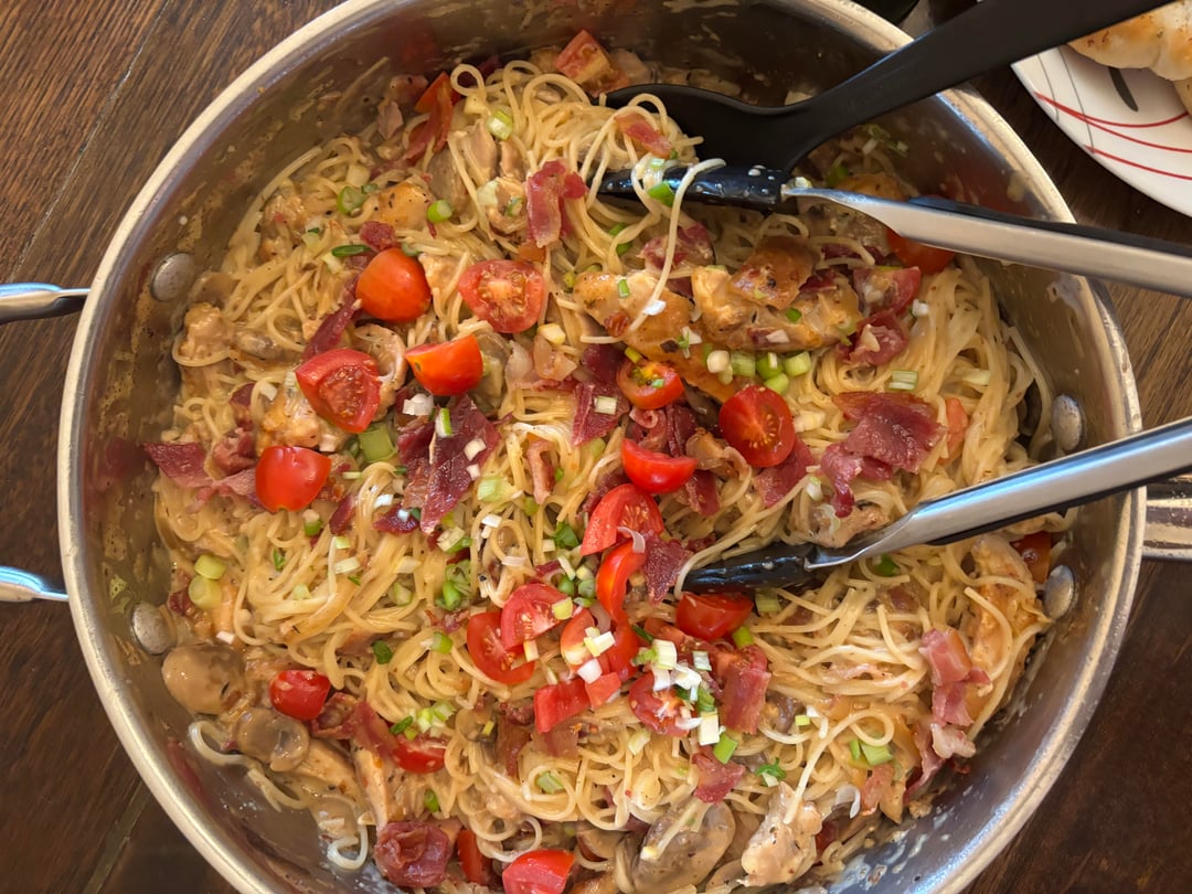 1. Angel hair pasta with mushroom cream sauce, chicken, and bacon – perfect date night meal 😋