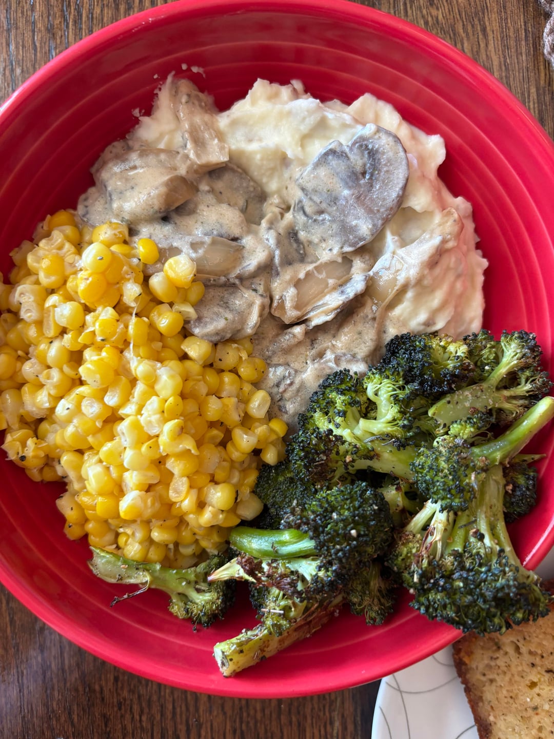 6. Mushroom stroganoff with mashed potatoes, corn, and roasted broccoli