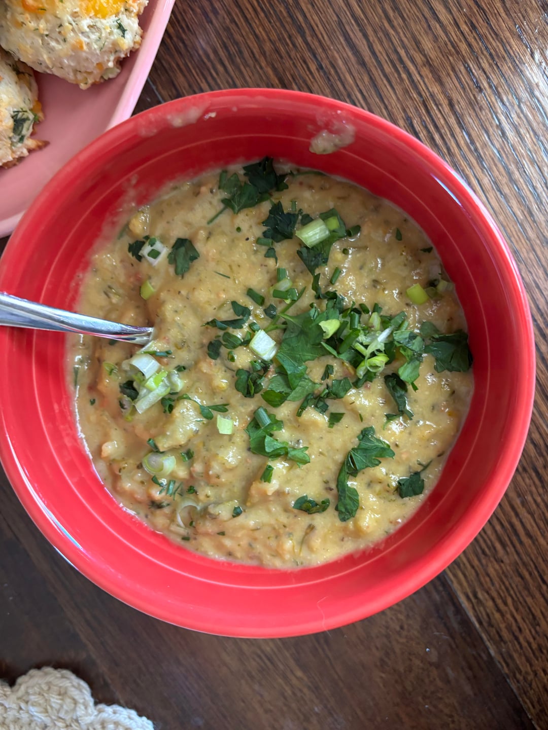 3. Broccoli and potato cheese soup, with cheddar and herb biscuits just out of frame