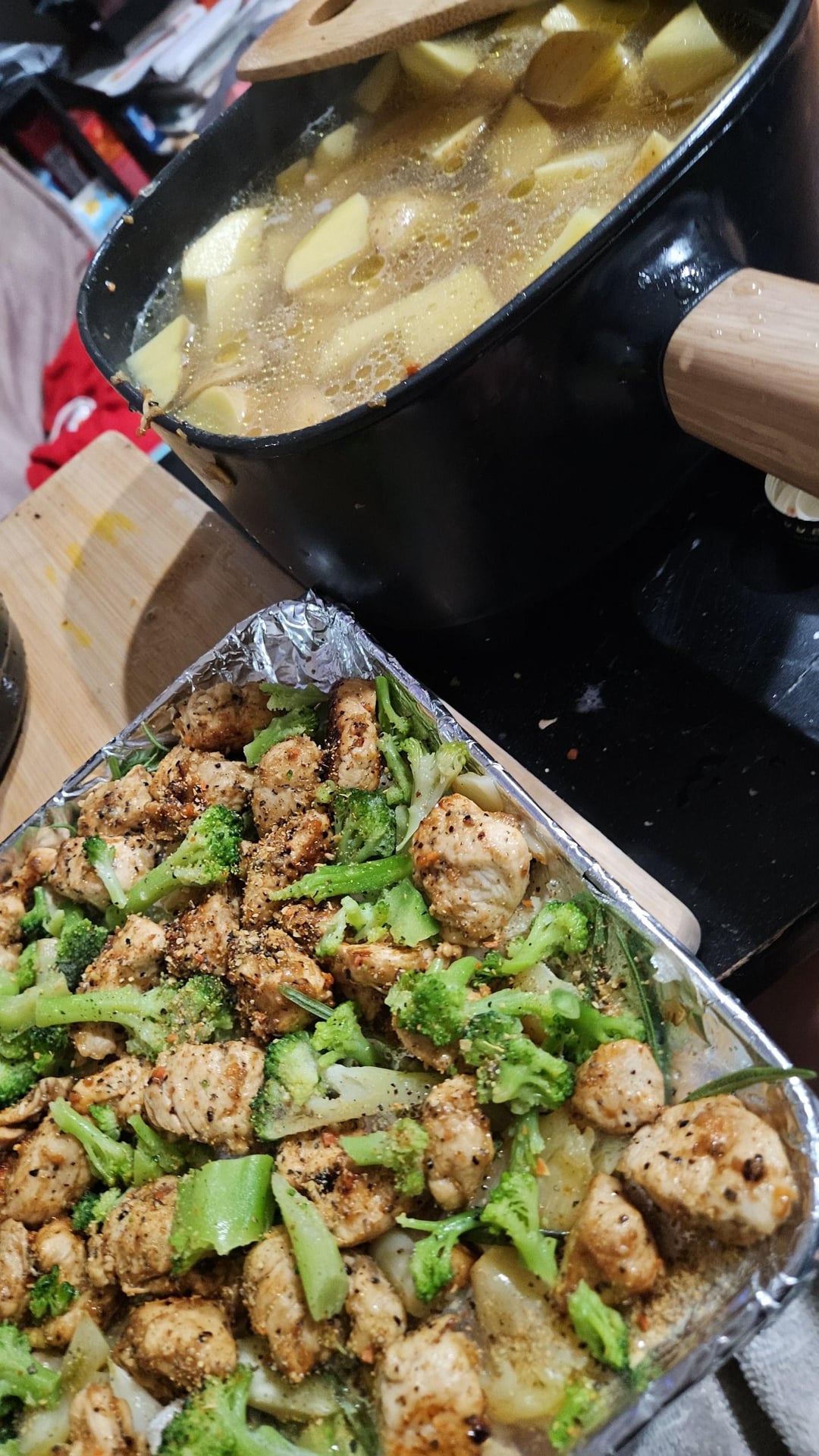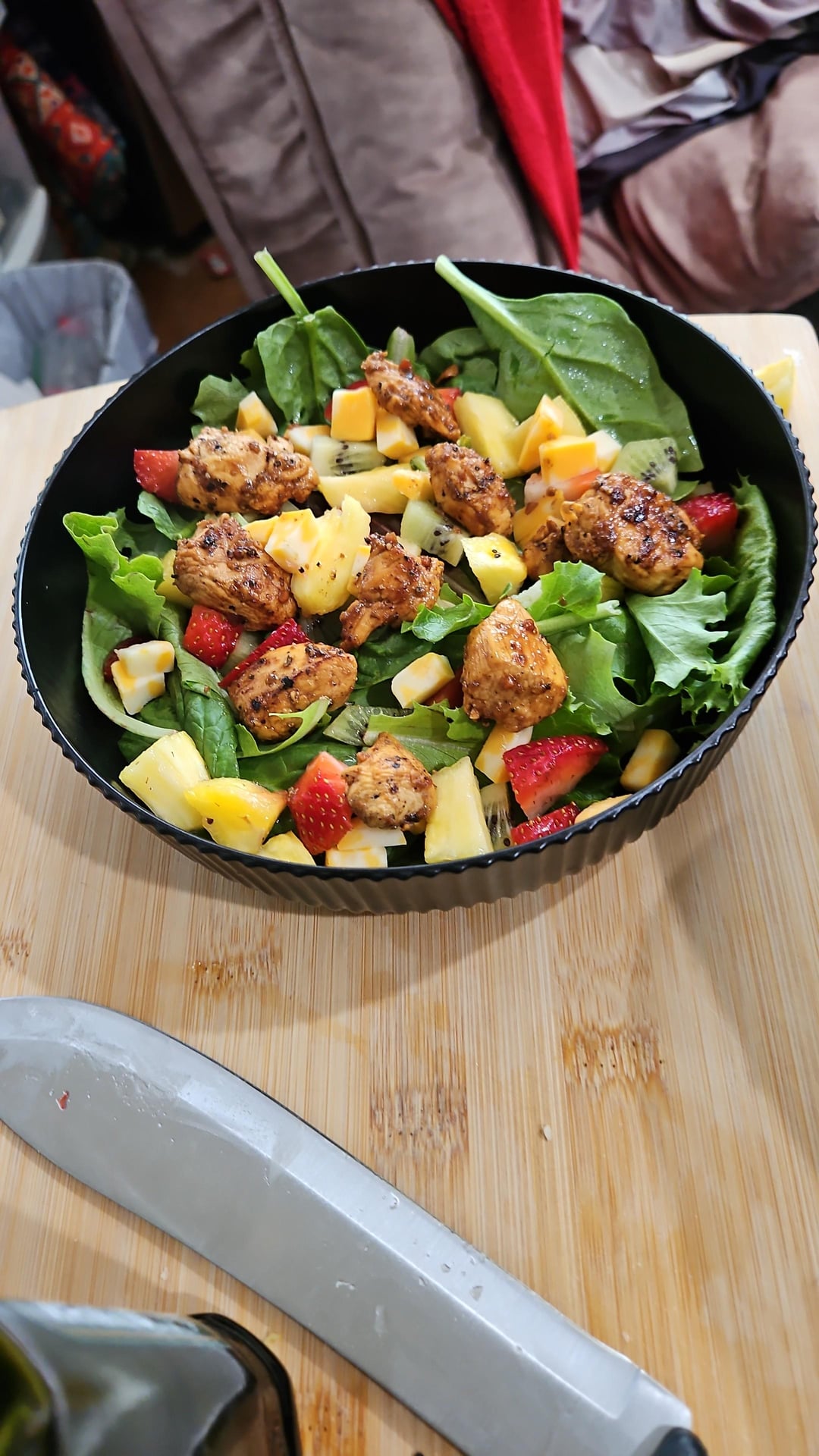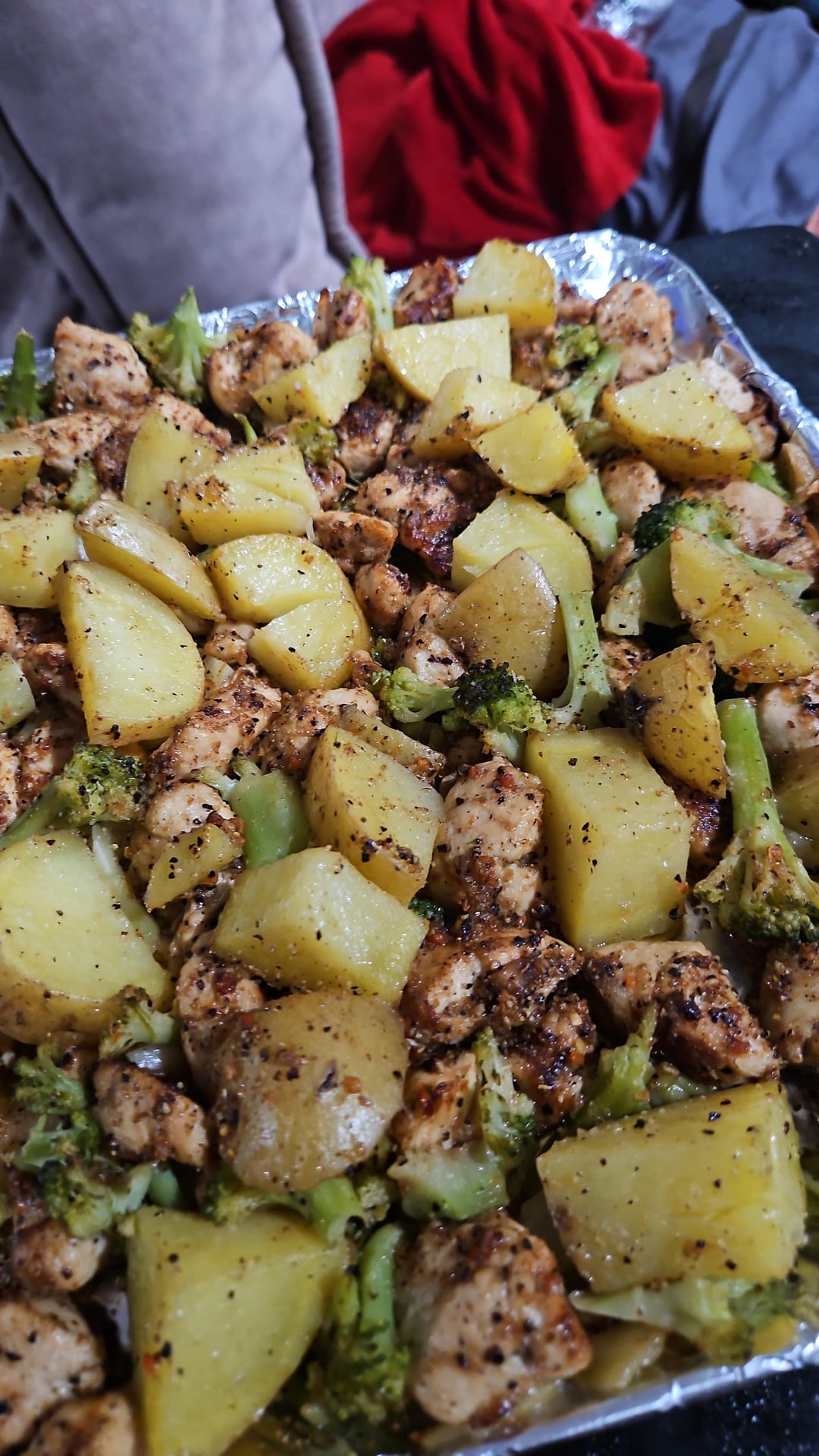 Tonight we did rosemary and lemmon pepper chicken snd potatoes and a fresh mix spring salad with fruit and hand tissed girlled chix and my own honey oil drizzle