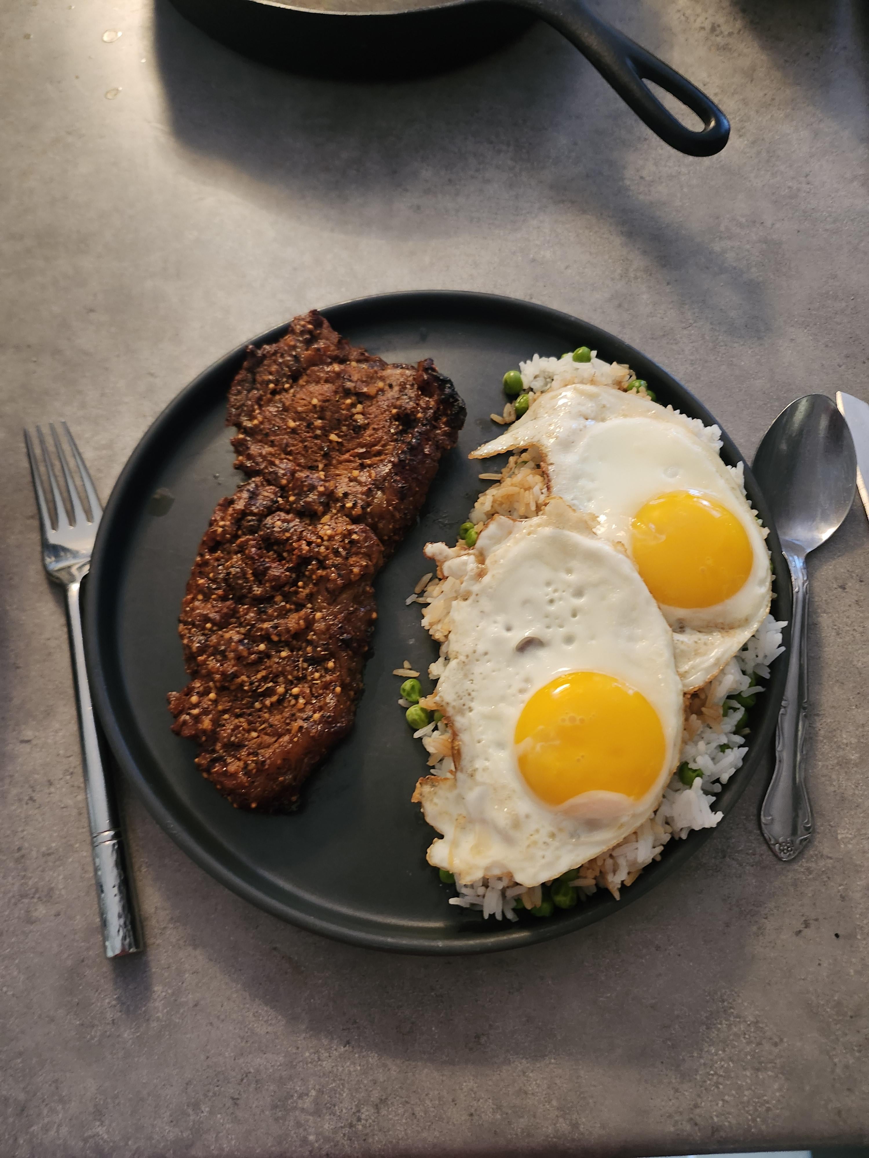 [Homemade] Steak Marinated in BBQ Sauce, Hot Sauce, Yorkchester Sauce, Salt, Pepper, and Montreal Steak Spice, with a side of Rice and Peas and Two Fried Eggs.