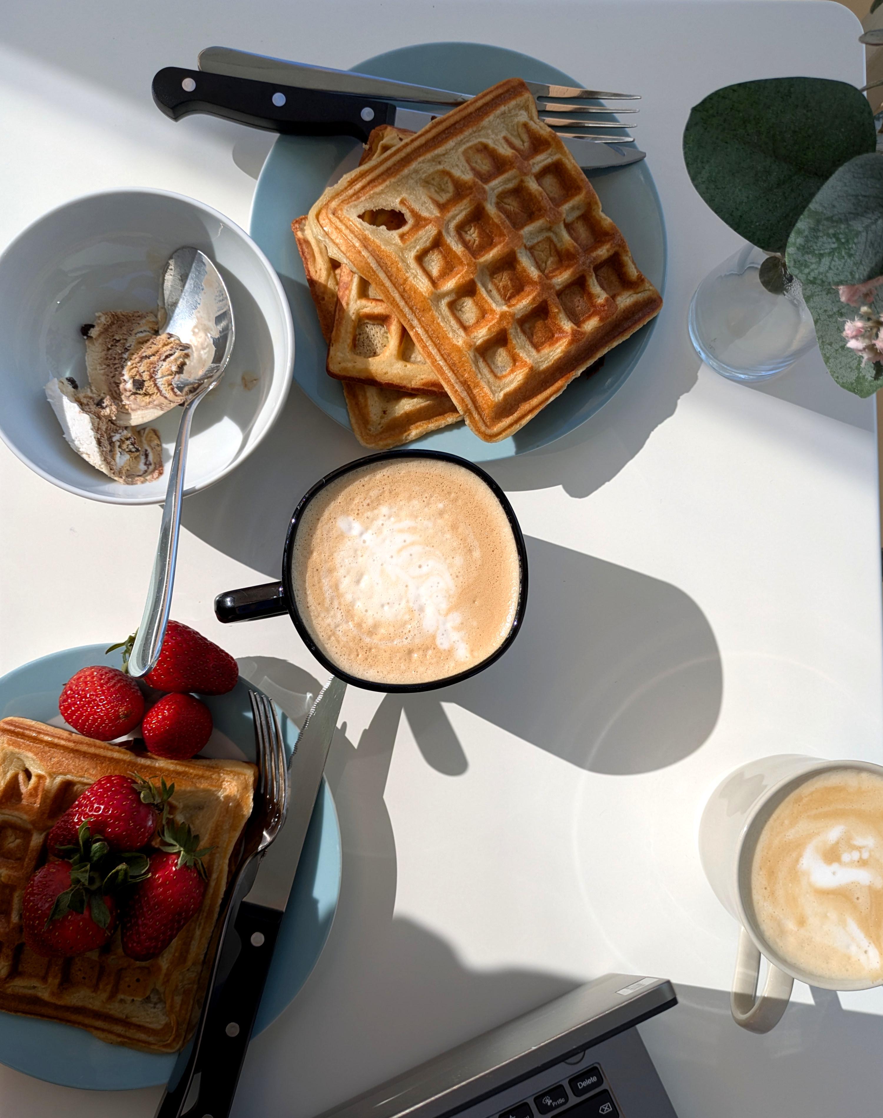 Coffee, fresh Strawberries, homemade Waffles, and store-bought ice-cream.