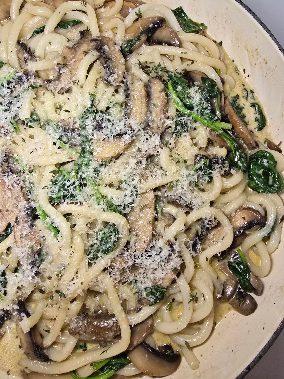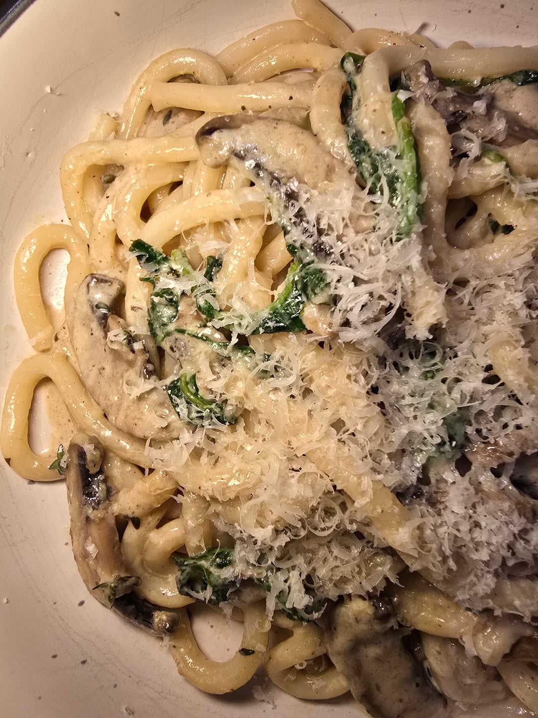 Portabello mushroom sautéed in butter, added salt, pepper, cream, thyme, miso paste, udon noodles and baby spinach. Garnished with truffle salt, lemon EVOO, parmesan. *chef's kiss* by silvastar88 Food