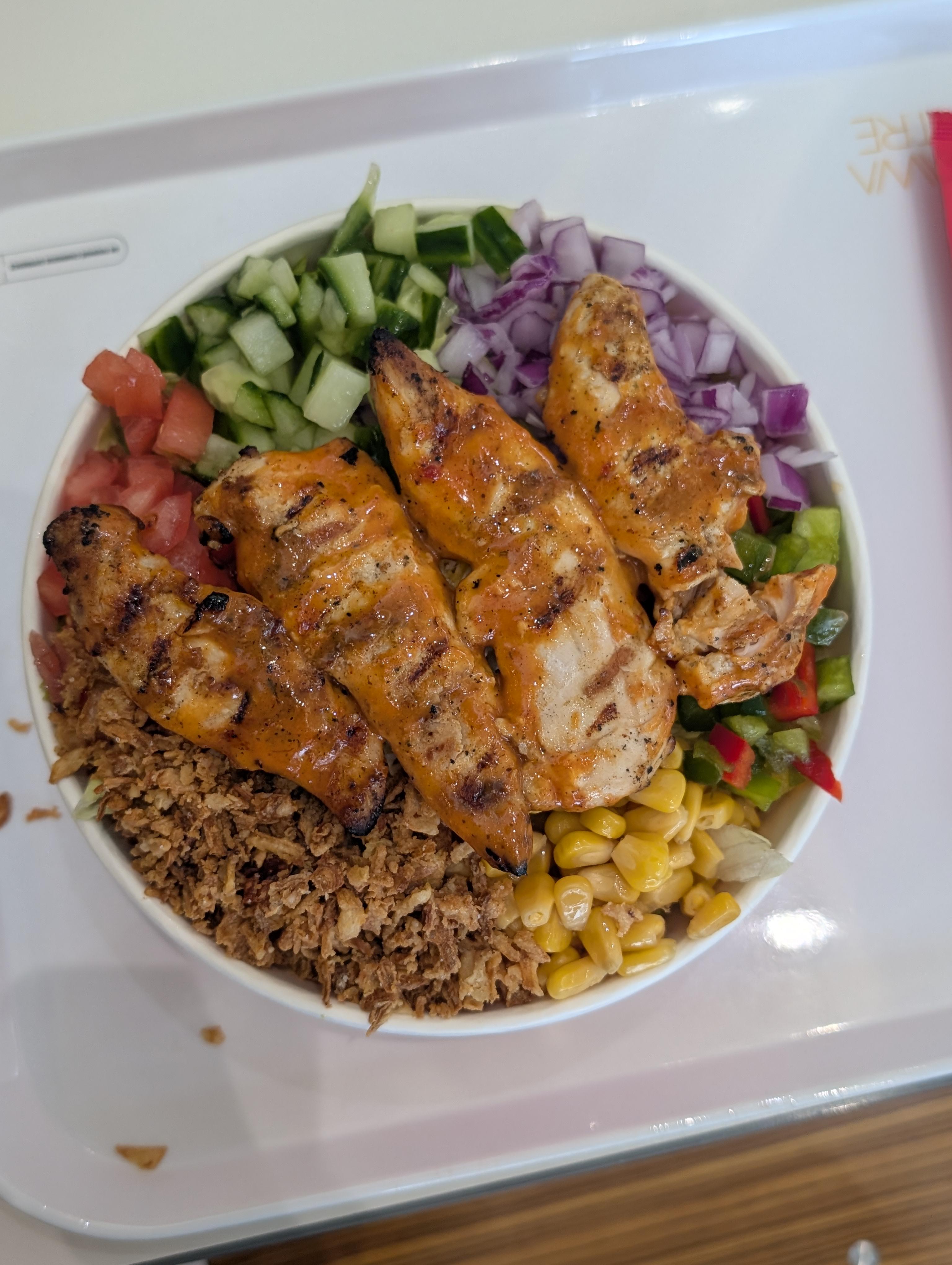 it's 4 chicken fillets (BBQ), cucumbers, tomatoes, onions, crispy onions, corn, peppers, sublime avocado sauce, and lettuce if anyone's interested in ordering the same if you have a Poulet Rouge near you.