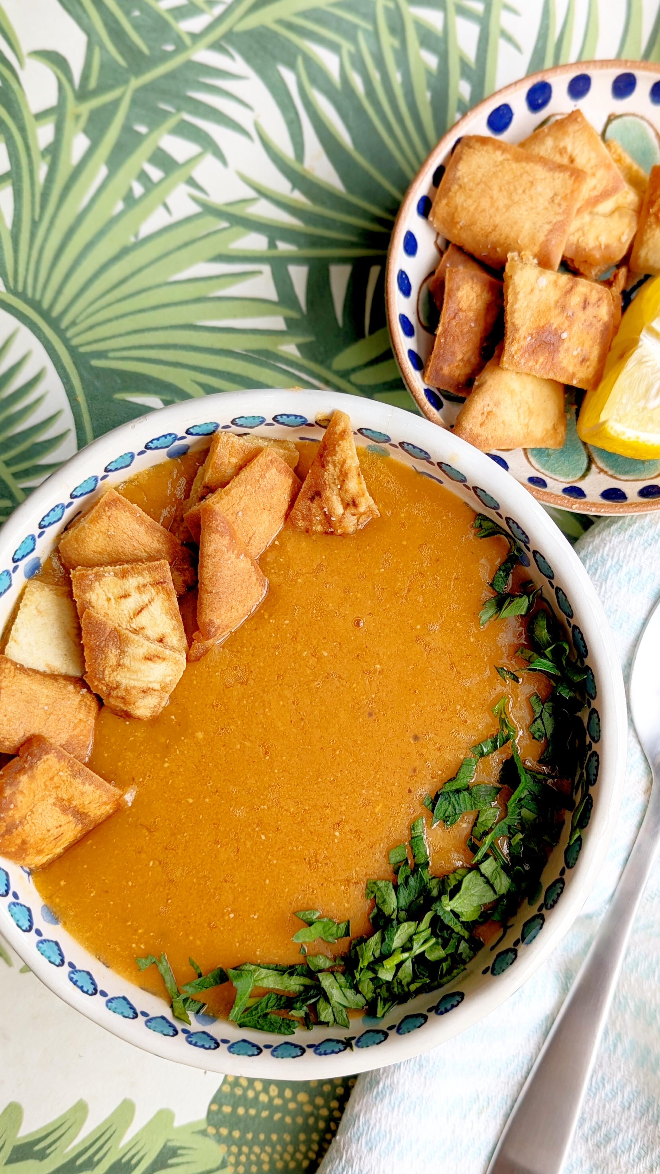 creamy vegan Egyptian red lentil soup. it's super easy to make with ingredients you might already have on hand, very cheap, nutritious, and most importantly DELICIOUS. this the recipe I grew up with https://amwhatieat.com/egyptian-red-lentil-soup-shorbat-ads/