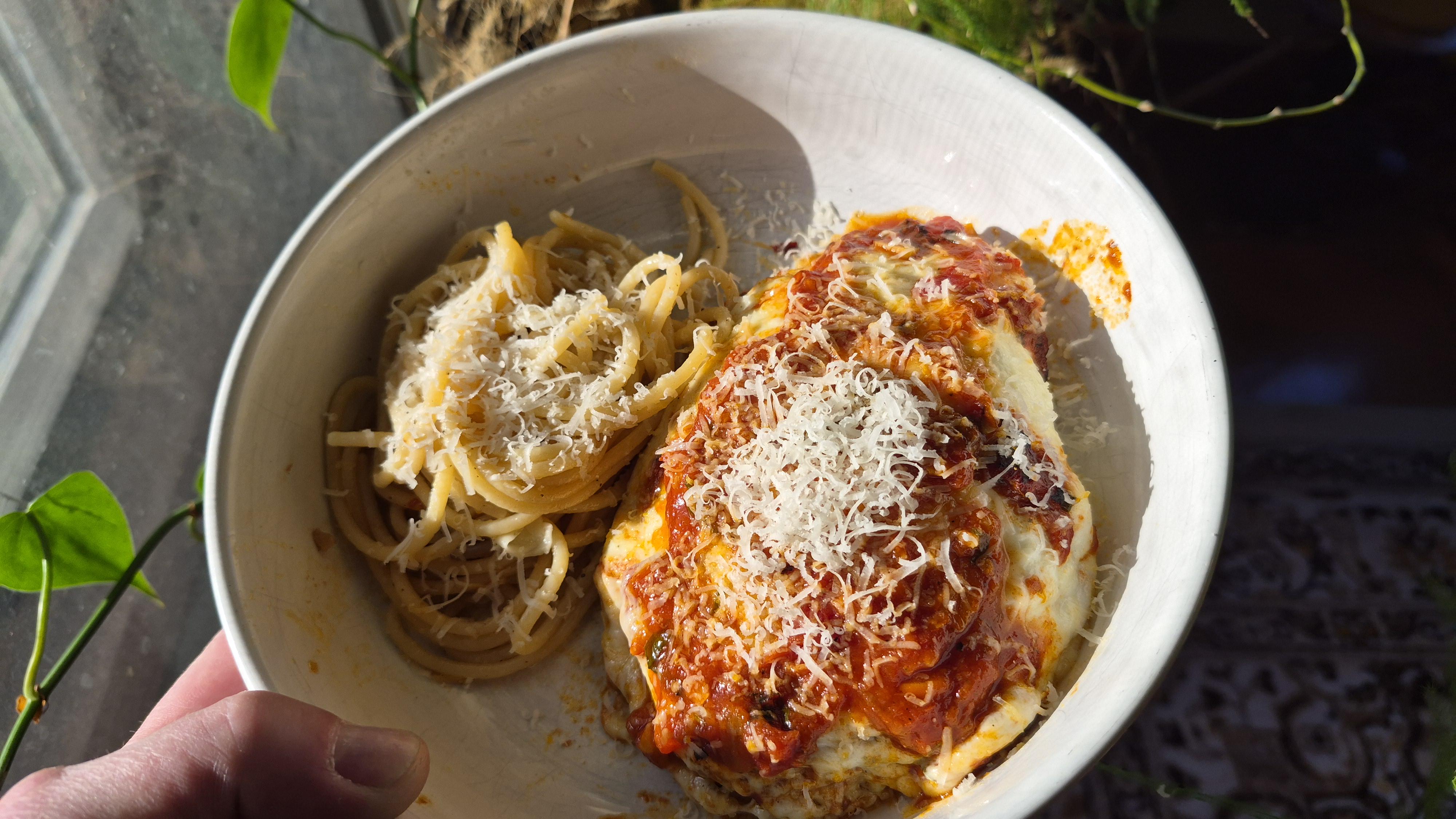Chicken parm, smoked Thai chili aglio e olio. Boy howdy it slaps. Disregard the errant thumb. by Upbeat_Land_4336 Dinner Tonight Tonight's Dinner