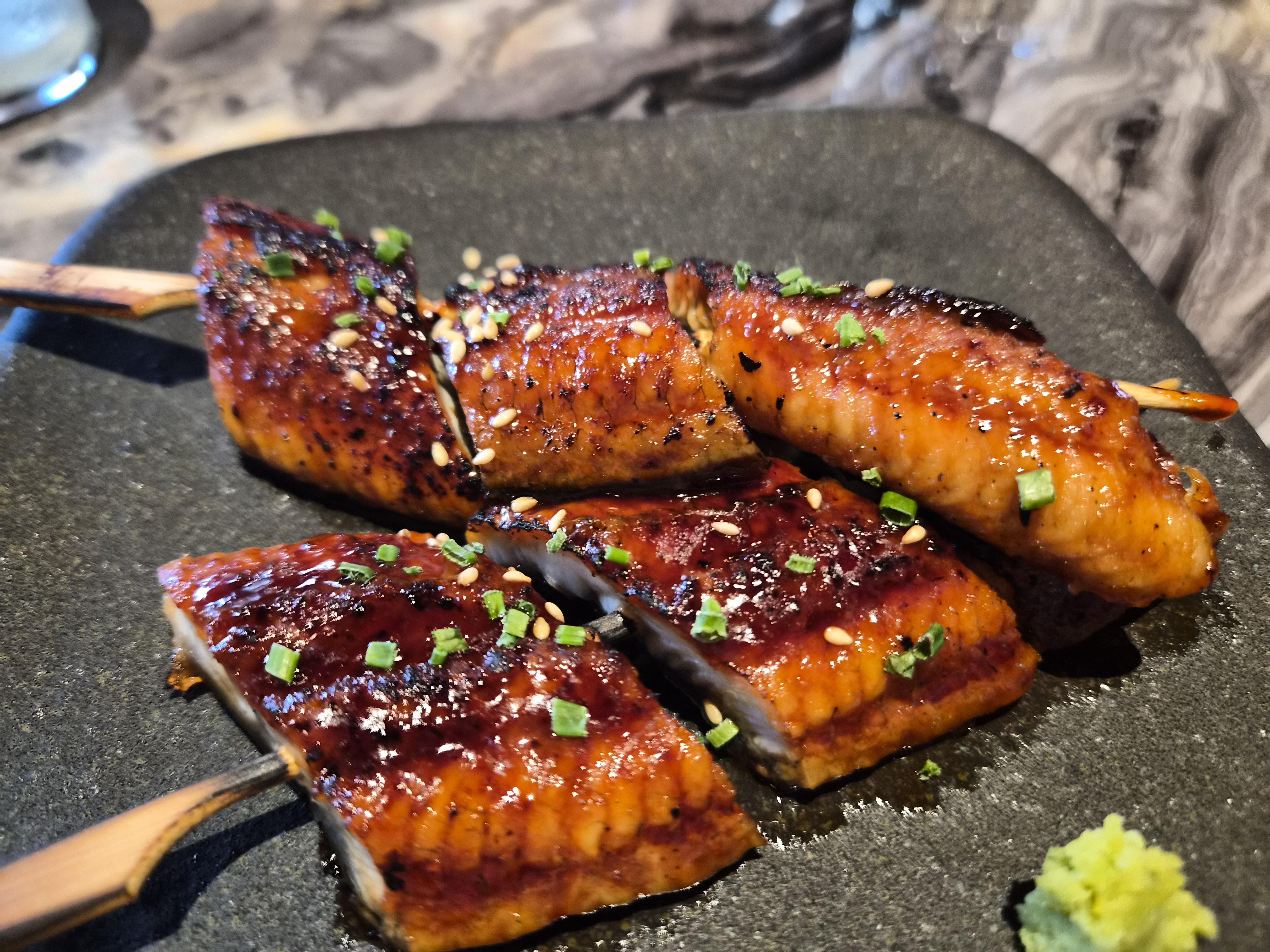 Unagi skewers (Japanese freshwater eel) rrilled with a soy based sauce.