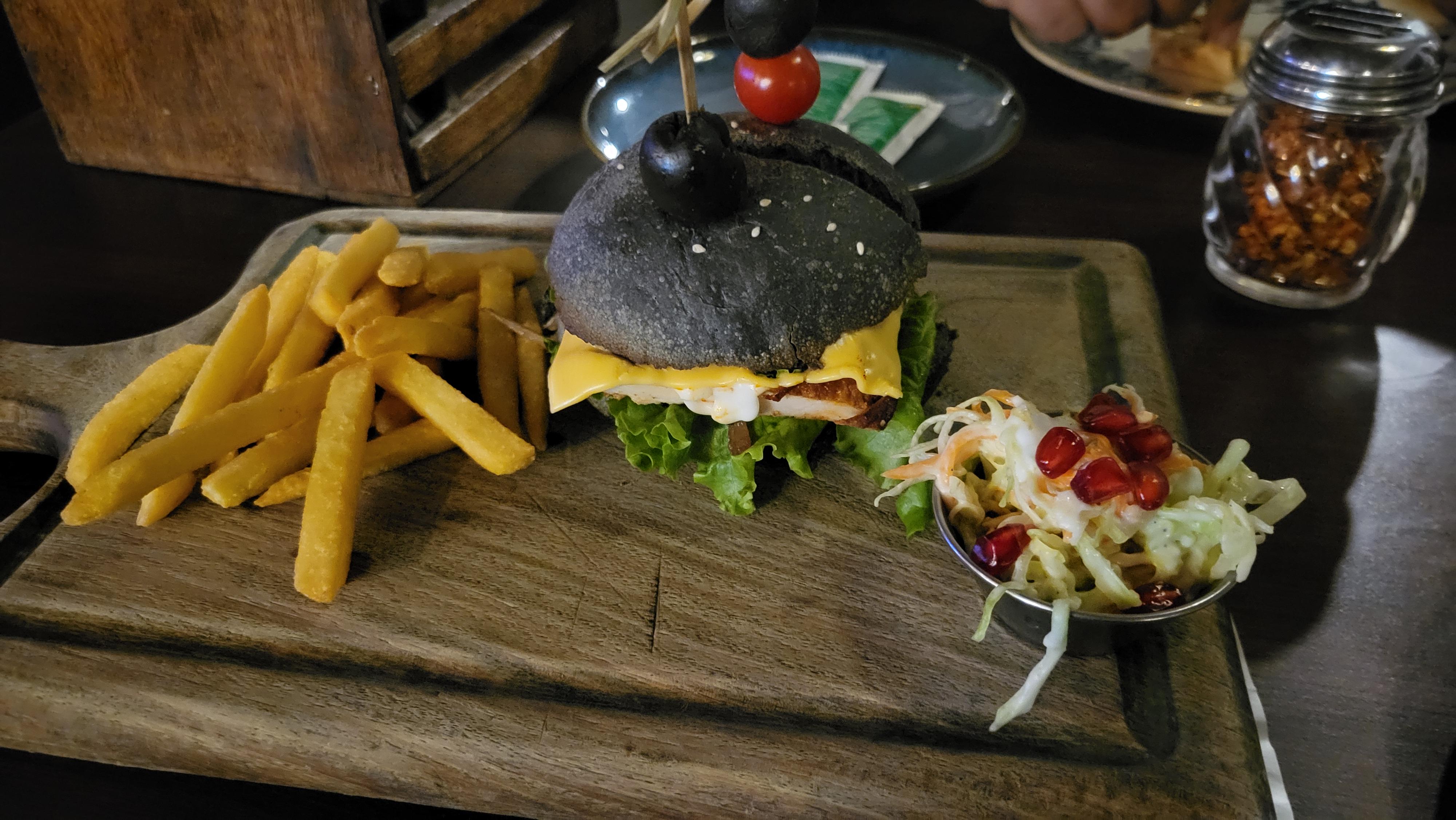 Black coloured bun with chicken patty, fries and coleslaw on the side. Quite a unique taste. by 9th_Realm Food