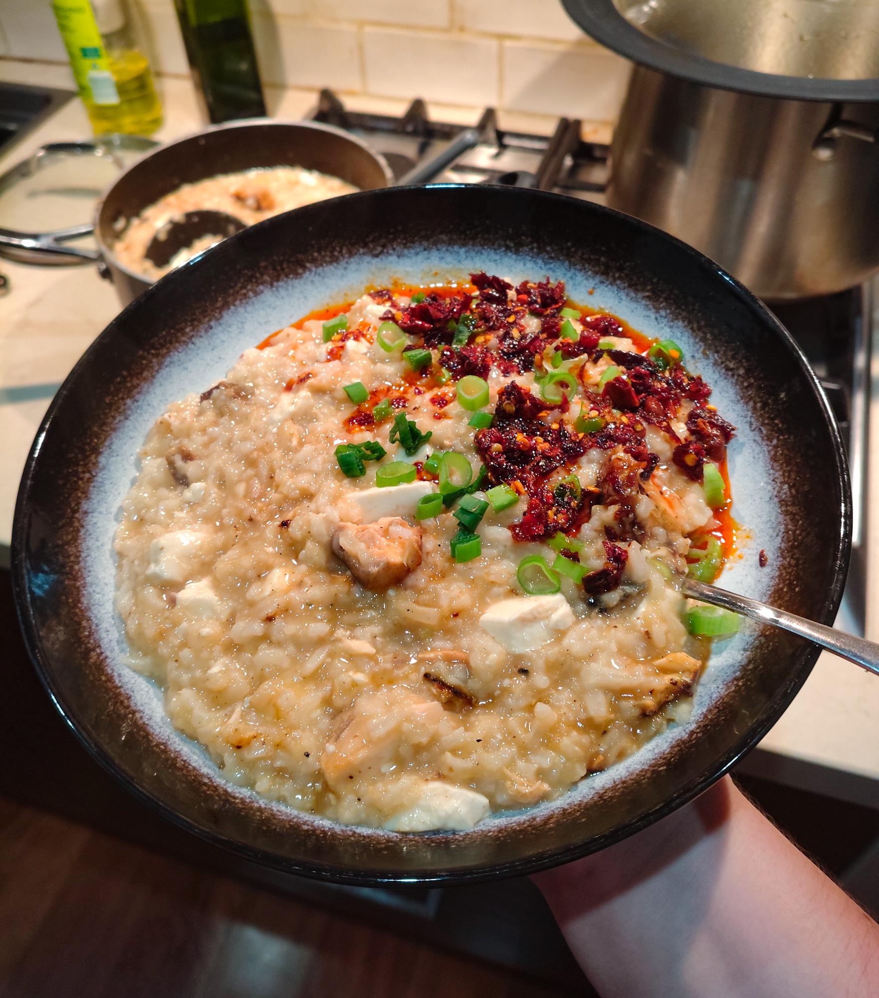 I stired in some salmon, silken tofu, lemon, and sesame oil. Garnished with spring onion and chilli crisp. Hope it heals me!