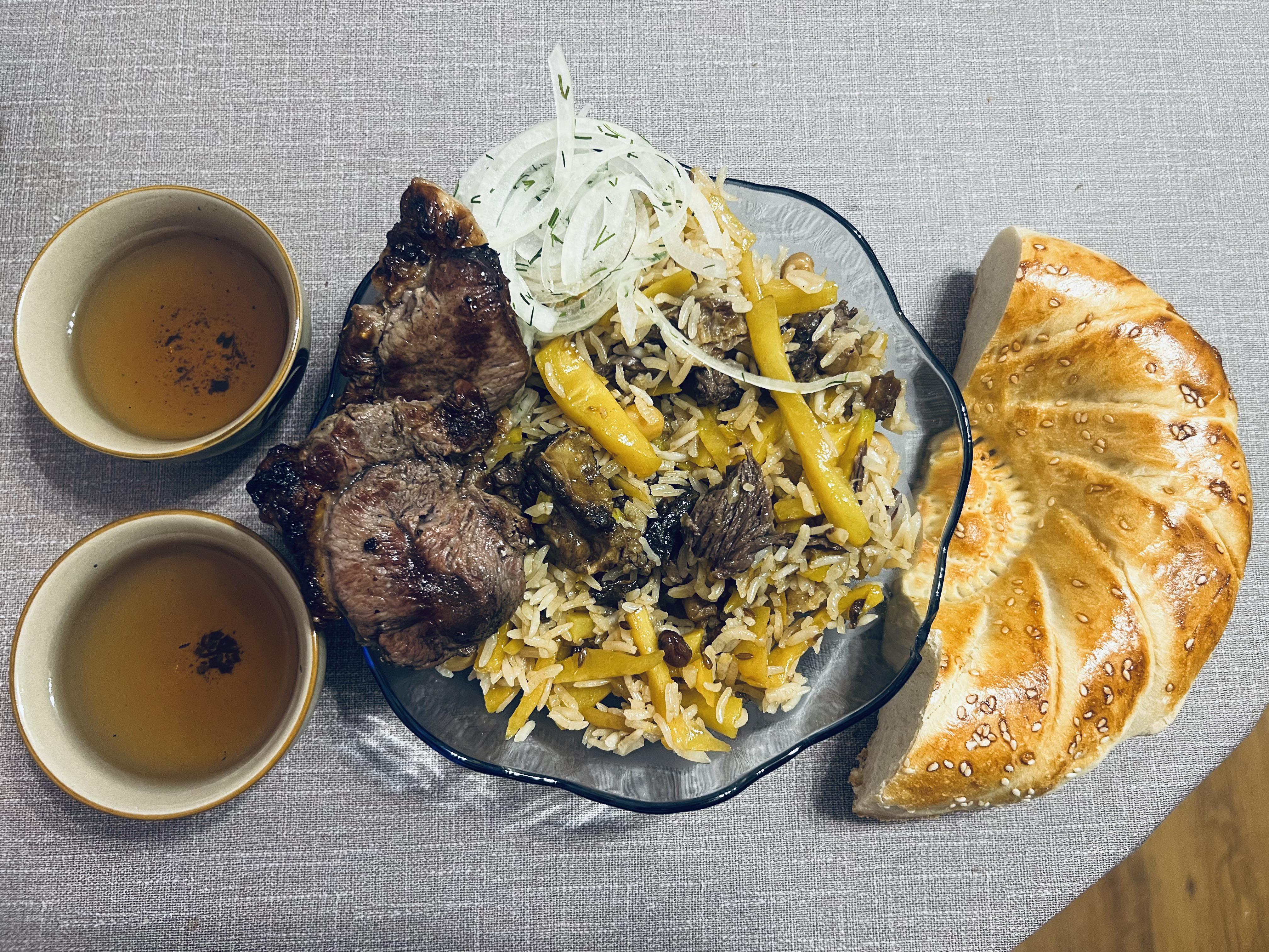 Traditional uzbek plov (rice with vegetables and heavily spiced with cumin), also lamb meat on bones with onion. Served with strong green tea and white bread by gaussgunn Food Porn